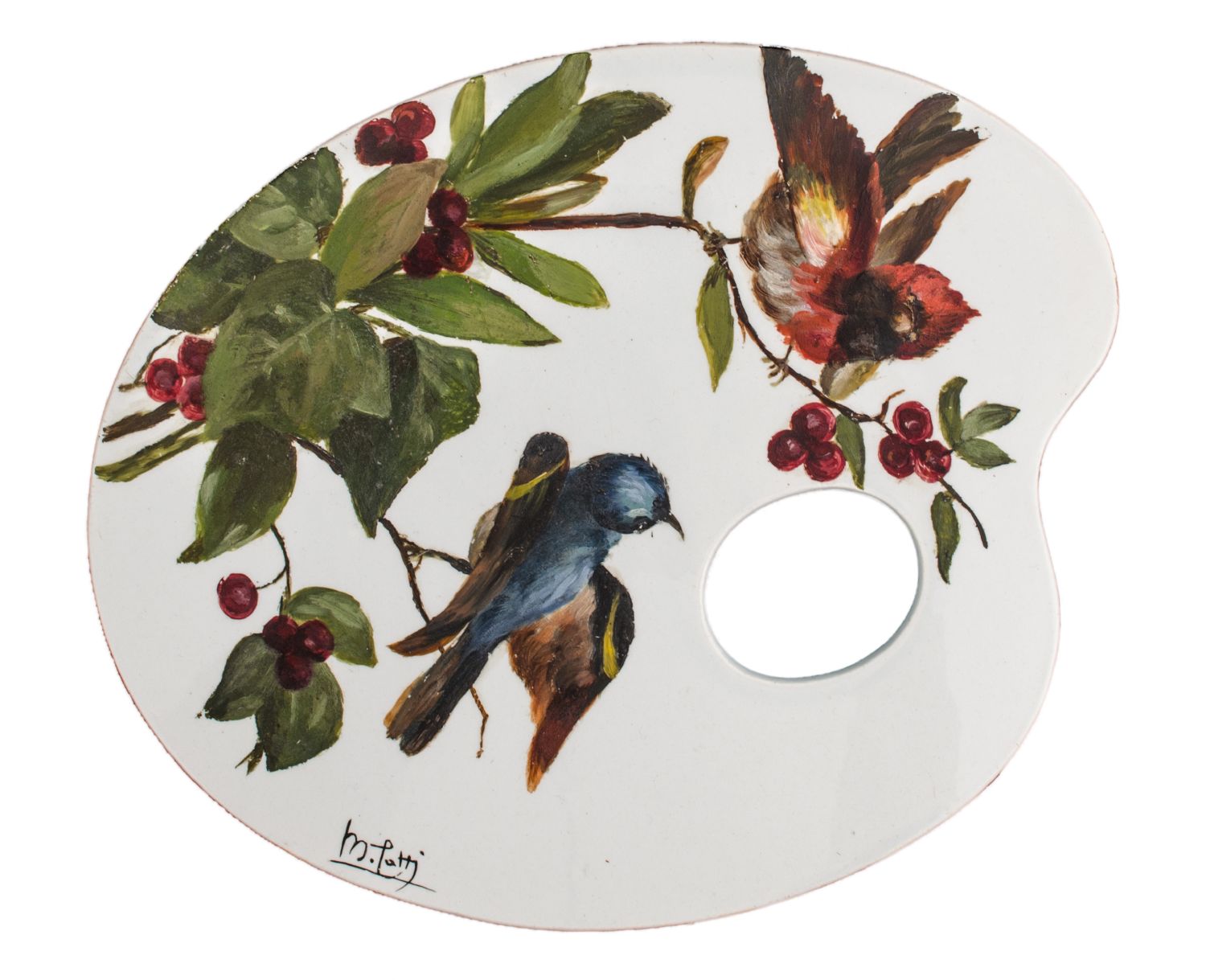 MICHELE CATTI (Palermo 1855 - 1914) OLIO dipinto su tavoletta da pittore in ceramica "Rami con volatili", firmato in basso. Misure: cm 23 x 18