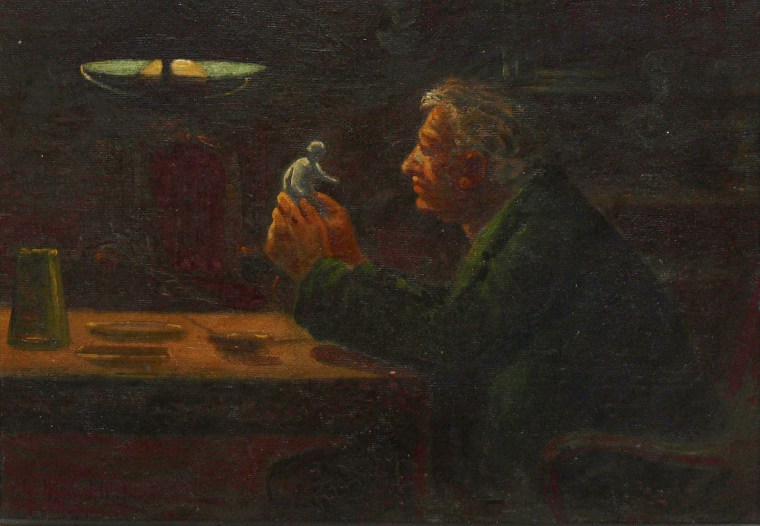 GIUSEPPE MINUTILLA LAURIA OLIO su tela applicata su tavoletta raffigurante "interno con personaggio". Metà '900 Misure: cm 26 x 20