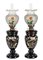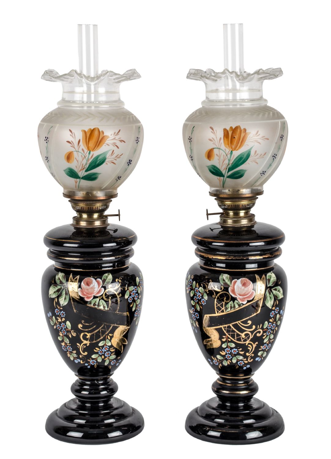 COPPIA VASI in opaline nei toni del nero dipinti a mano a motivo floreale e fogliaceo e lumeggiato in oro, tubi e bocce in vetro dipinto a motivo floreale (rotture). Sicilia primi '900 Misure: h cm 65
