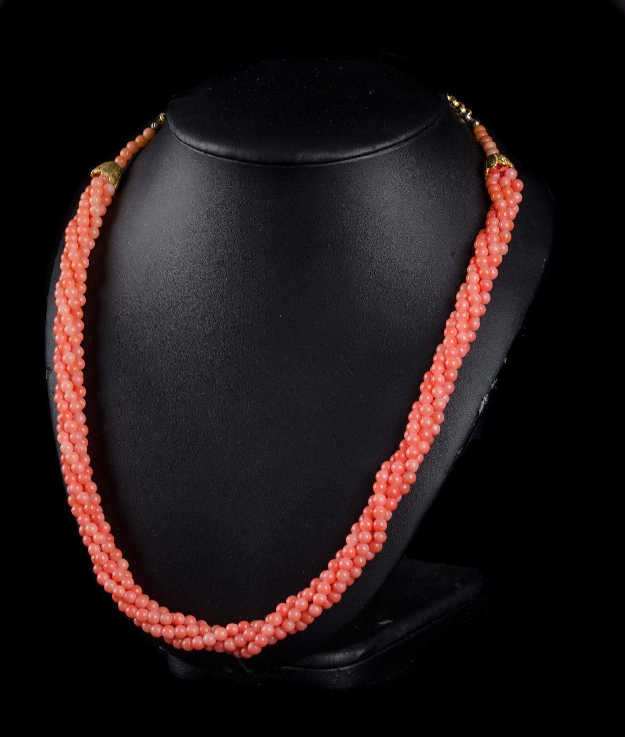 COLLANA a torciglione di corallo rosa con susta e catena in metallo dorato. XX secolo