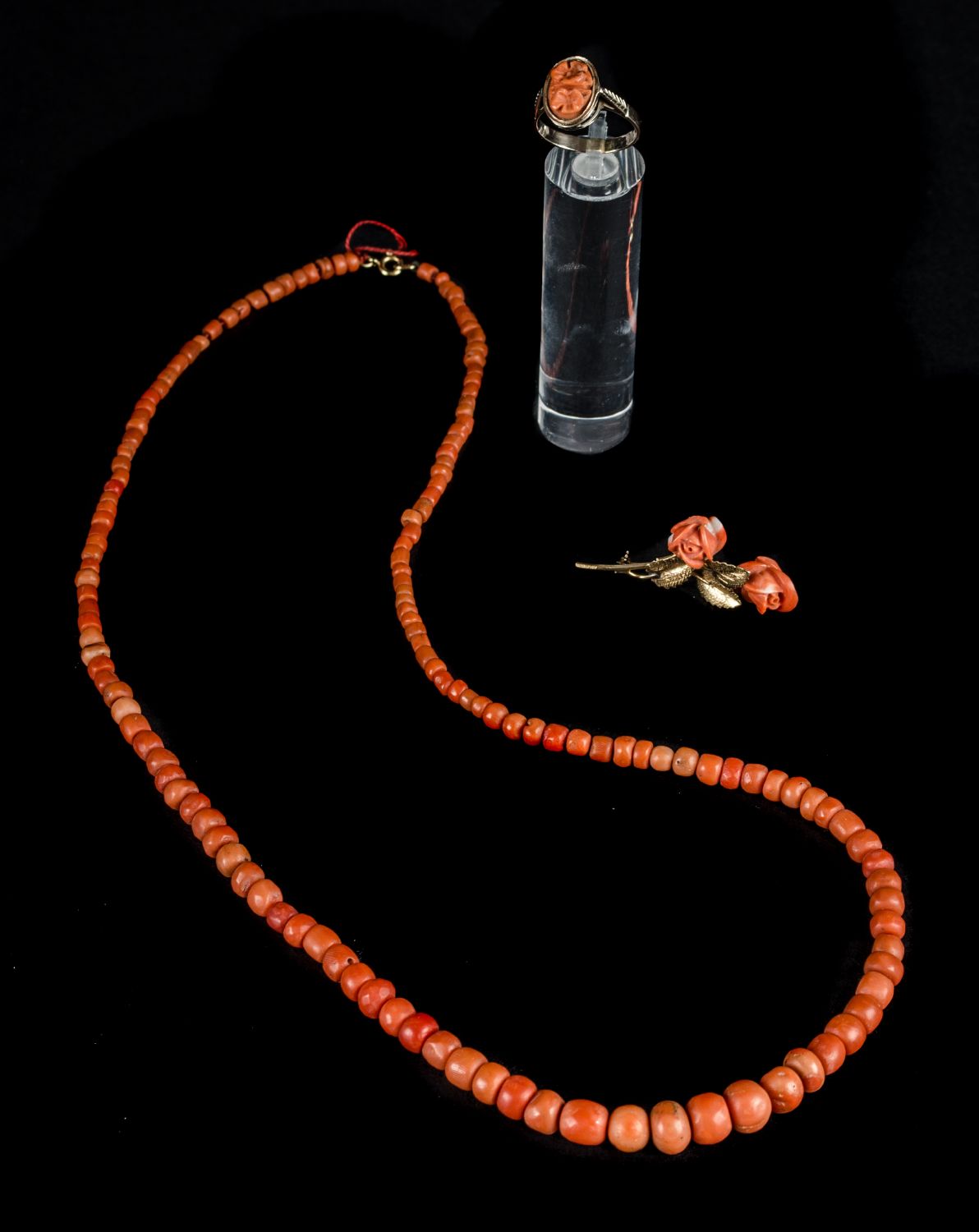 PARURE in oro giallo 18 Kt. composta da COLLANA, ANELLO e da SPILLA in corallo.