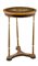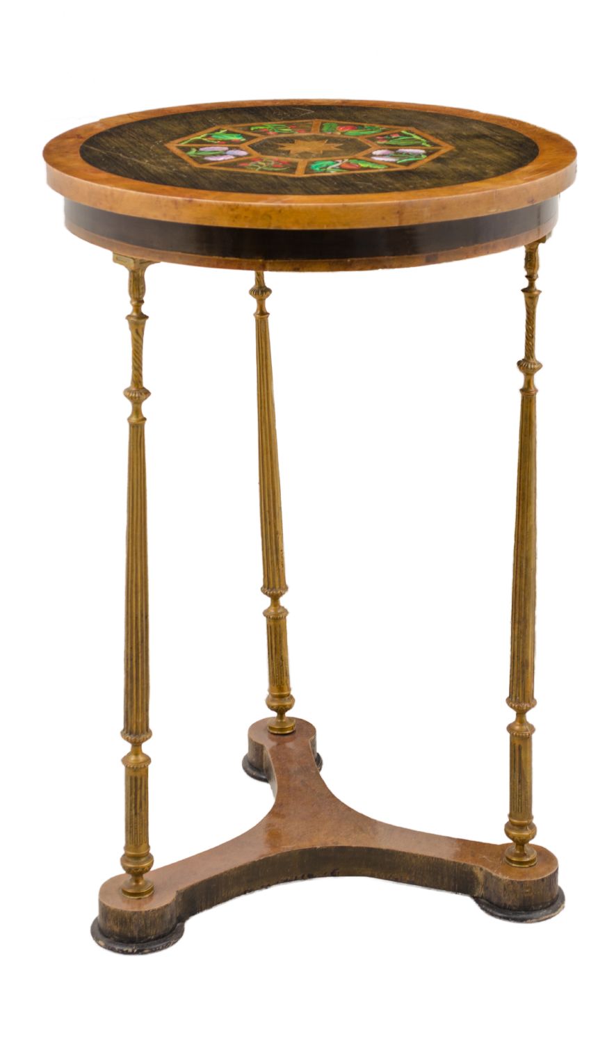 TAVOLINO in legno ebanizzato, radica di tuja, piano dipinto ed intarsiato, piedi in bronzo. Italia XX secolo Misure: diametro cm 60 x h 85
