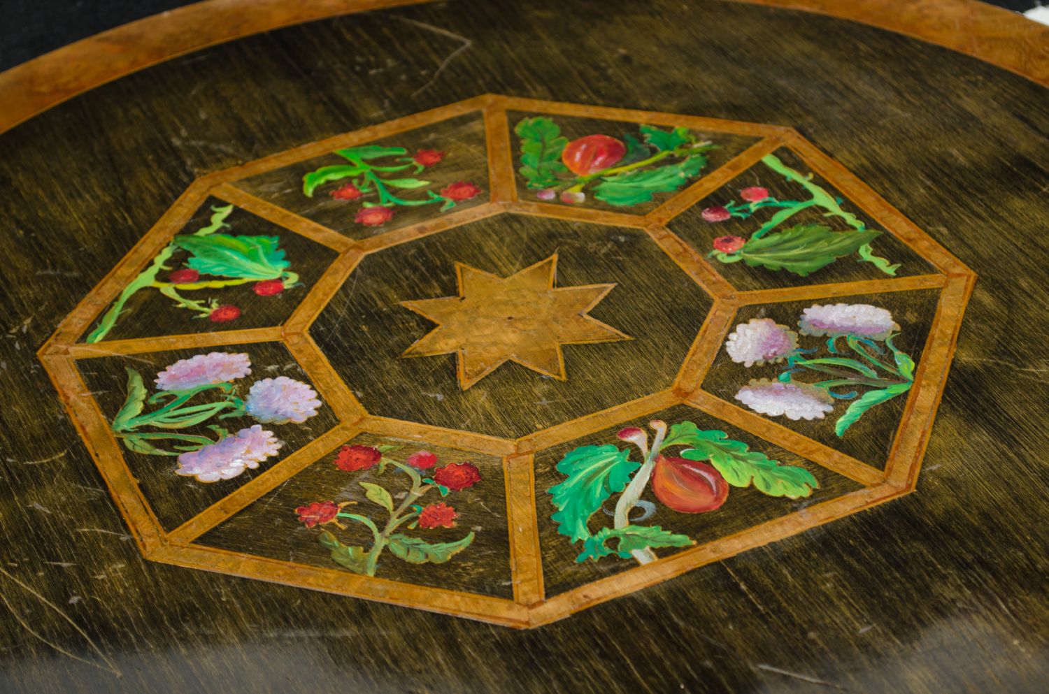 TAVOLINO in legno ebanizzato, radica di tuja, piano dipinto ed intarsiato,...