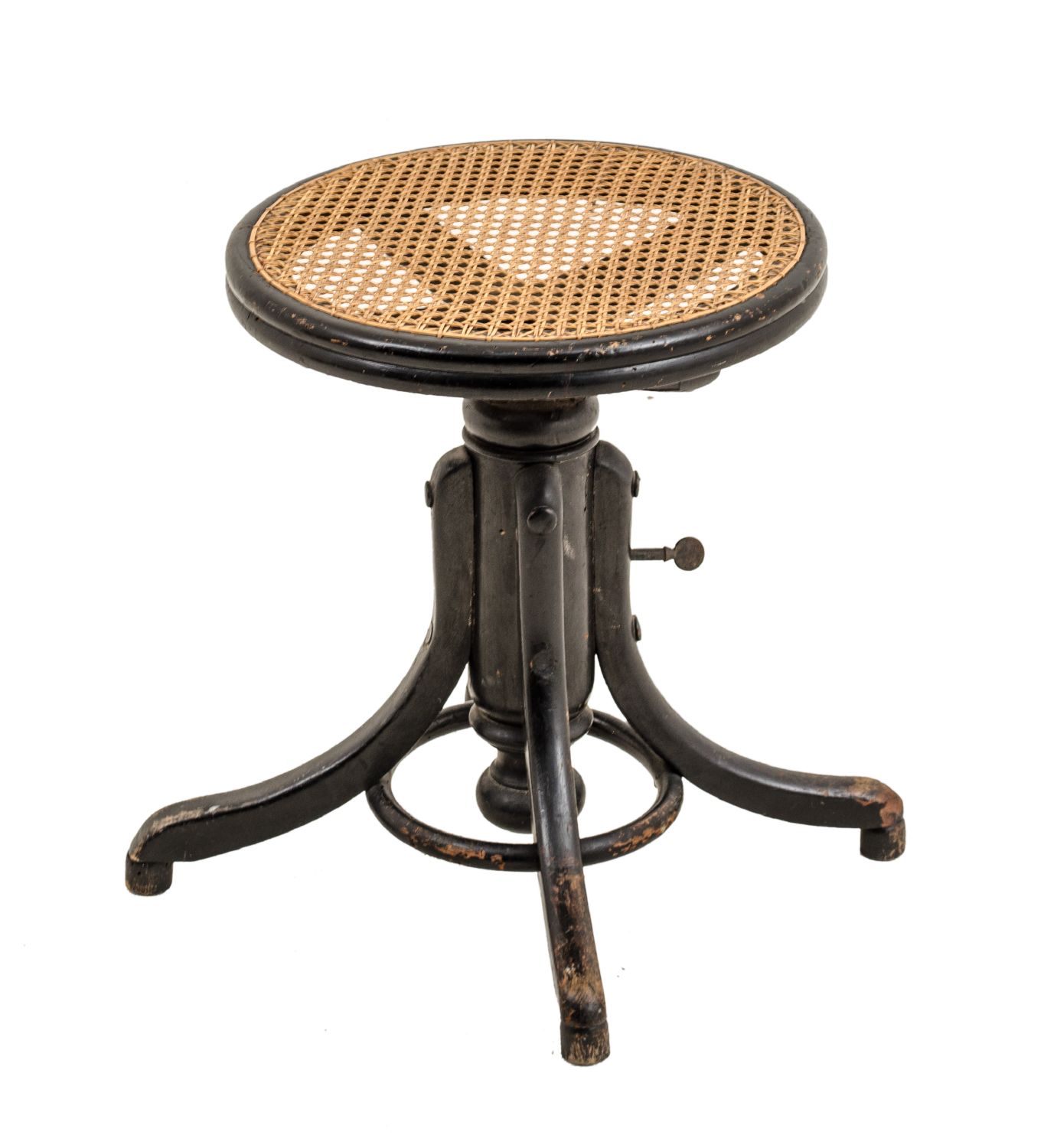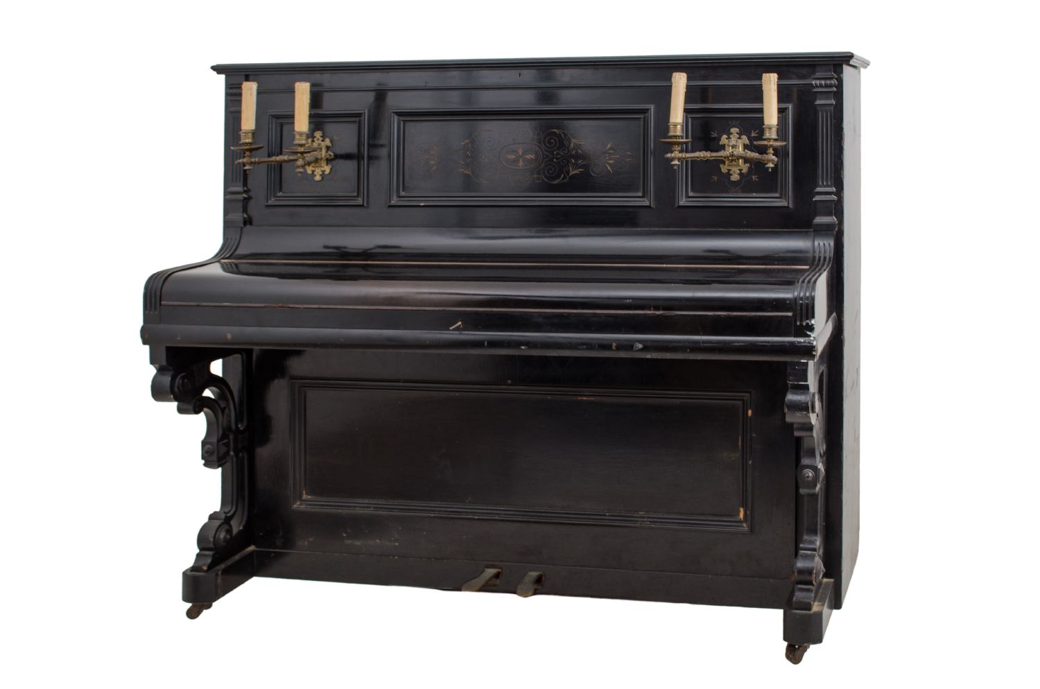 PIANOFORTE G. Klingmann & Co in legno ebanizzato con banco in ghisa e corde crociate con applique a due luci e sgabello. Primi '900 Misure: cm 148 x 61 x h 119