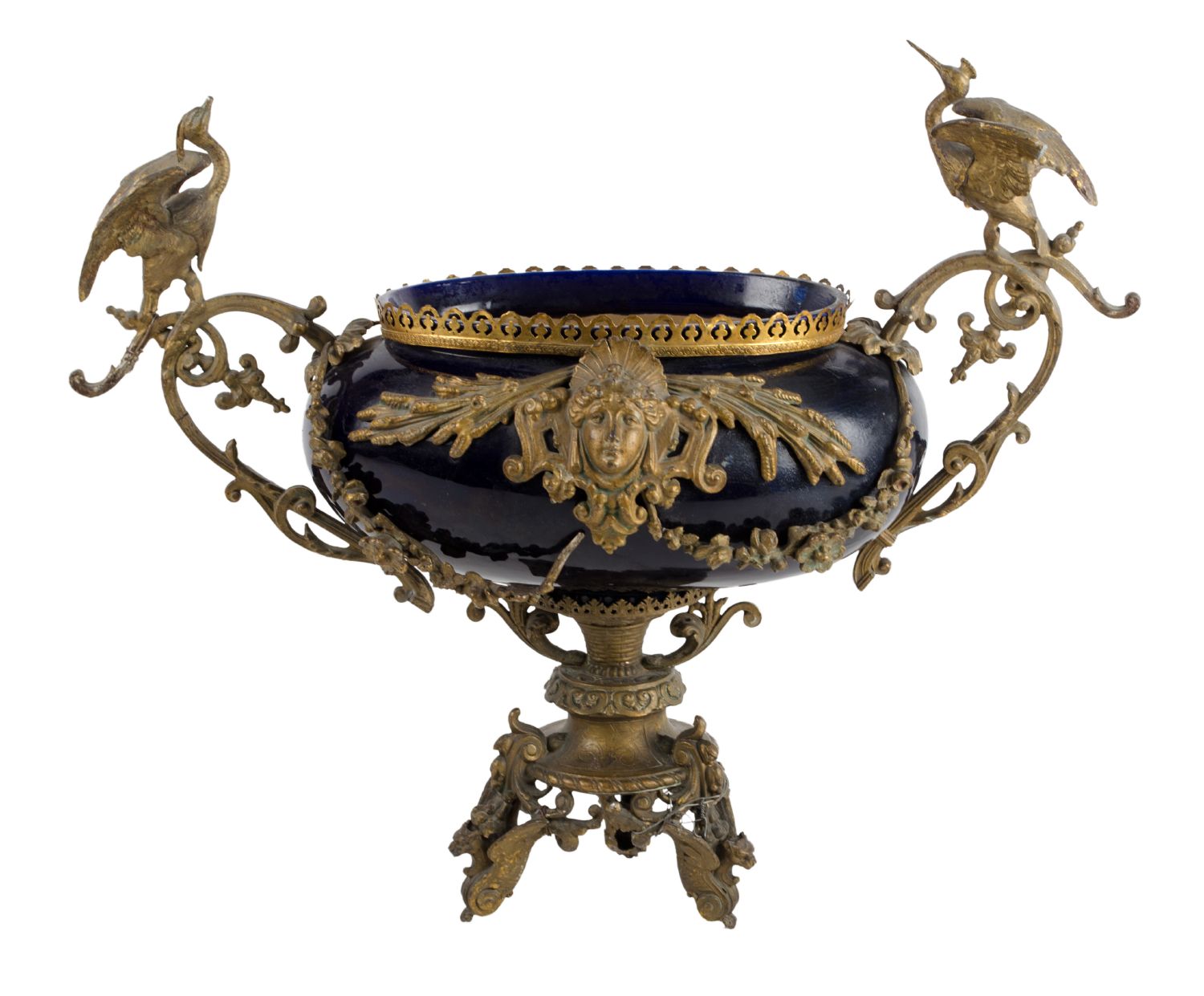 CENTROTAVOLA ovale in metallo con coppa in porcellana (restauri e difetti). Francia fine '800 Misure: cm 56 x 23 x h 48,5