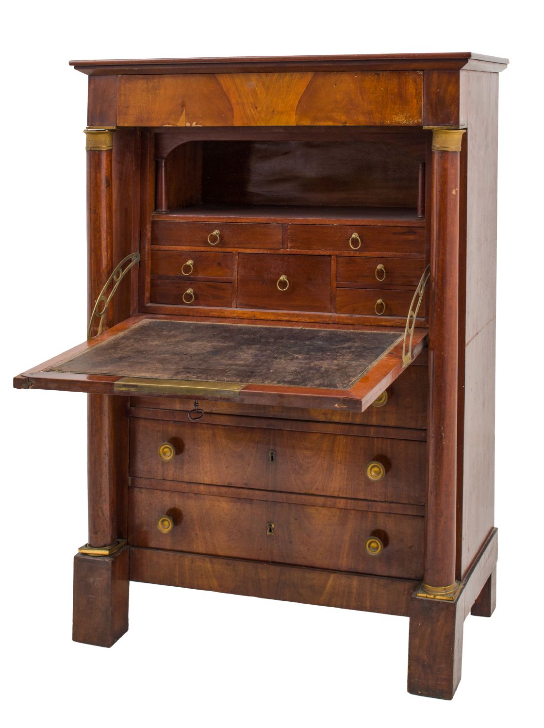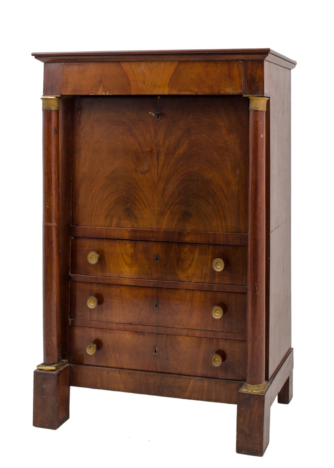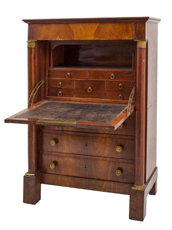 SECRETAIRE Impero in mogano e piuma di mogano con capitelli delle colonne e maniglie in bronzo dorato a mercurio. Francia primi '800 Misure: cm 95 x 46 x h 138