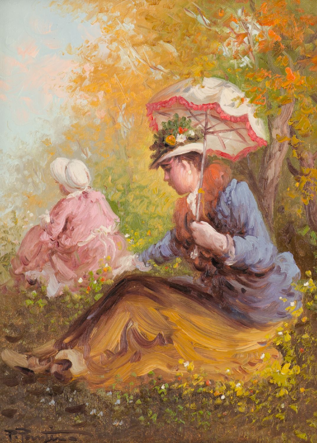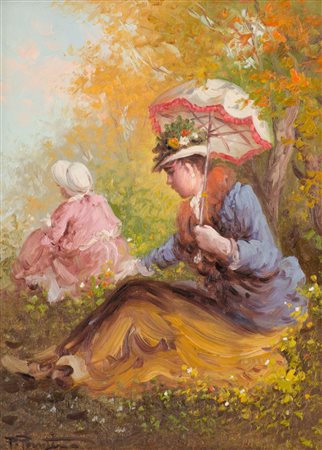 PIETRO PANTINO (Palermo 1941) OLIO su tela "femmes au parc". Misure: cm 30 x 40