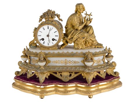 OROLOGIO in metallo dorato ed alabastro con scultura raffigurante "suonatore d'arpa", base dorata in oro zecchino. Francia XIX secolo Misure: cm 40 x 33