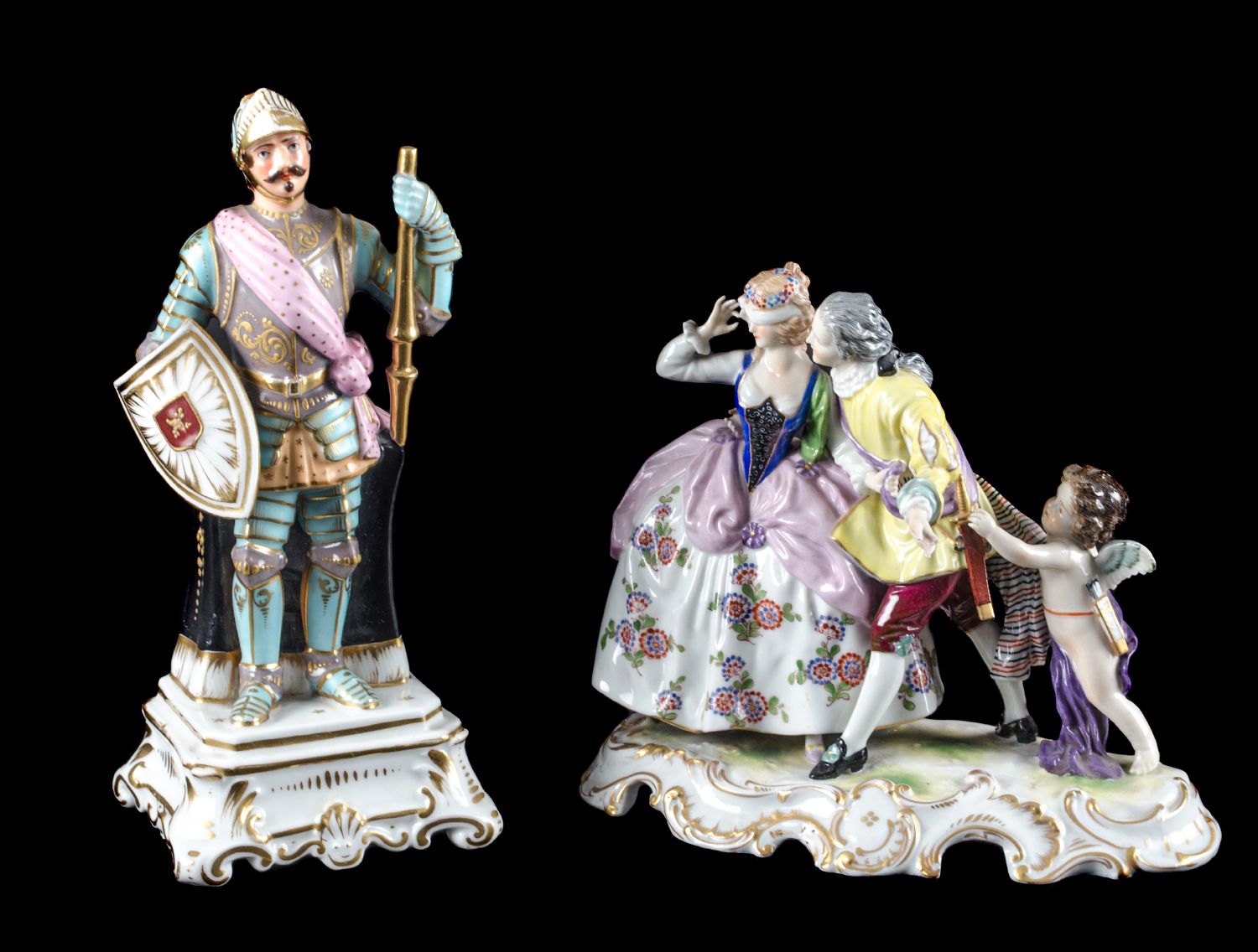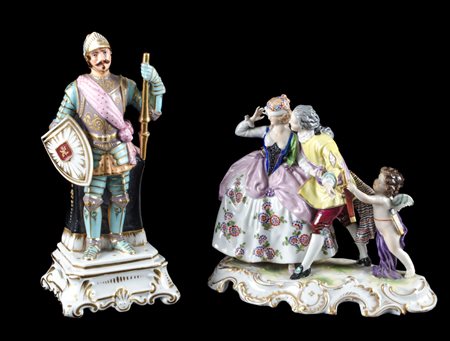 LOTTO composto da SCULTURA in porcellana Capodimonte raffigurante "scena galante con putto" e da SCULTURA in porcellana raffigurante "cavaliere" (rotture). XX secolo Misure: varie