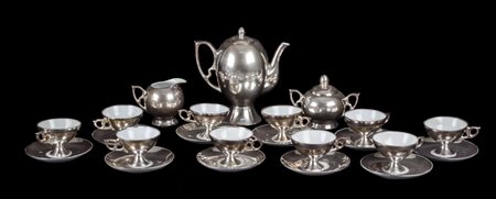 SERVIZIO da caffe' composto da CAFFETTIERA, ZUCCHERIERA, LATTIERA e da 10 TAZZINE con piattini in porcellana bianca argentata (rotture). Italia XX secolo Misure: varie