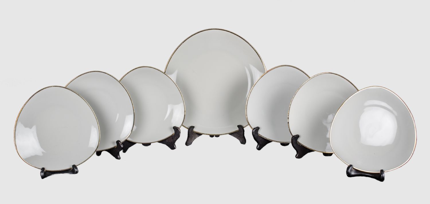 SERVIZIO da dolce in porcellana Winterling nei toni del beige con perfilo in ro composto da PIATTO e da sei PIATTINI. XX secolo Misure: varie