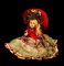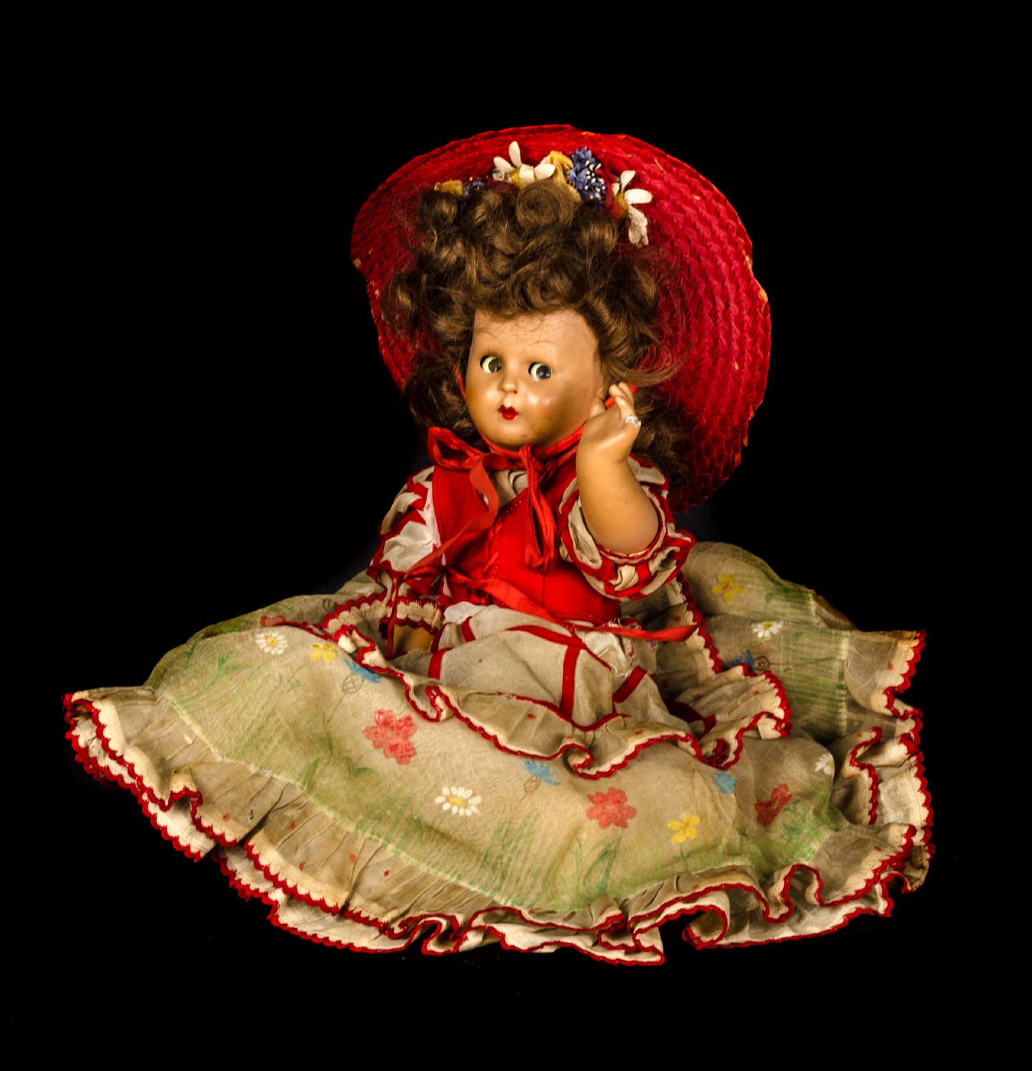 BAMBOLA con vestito in organza dipinta a motivo floreale (mancanze). XX secolo Misure: h cm 42