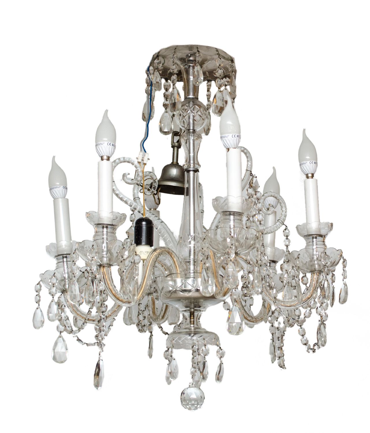 LAMPADARIO a sei luci in vetro con brindoli. XX secolo Misure: h cm 75