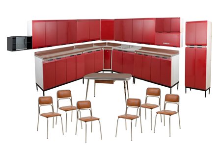 CUCINA in ferro smaltato con TAVOLO e 4 SEDIE. Anni '60 Misure: varie