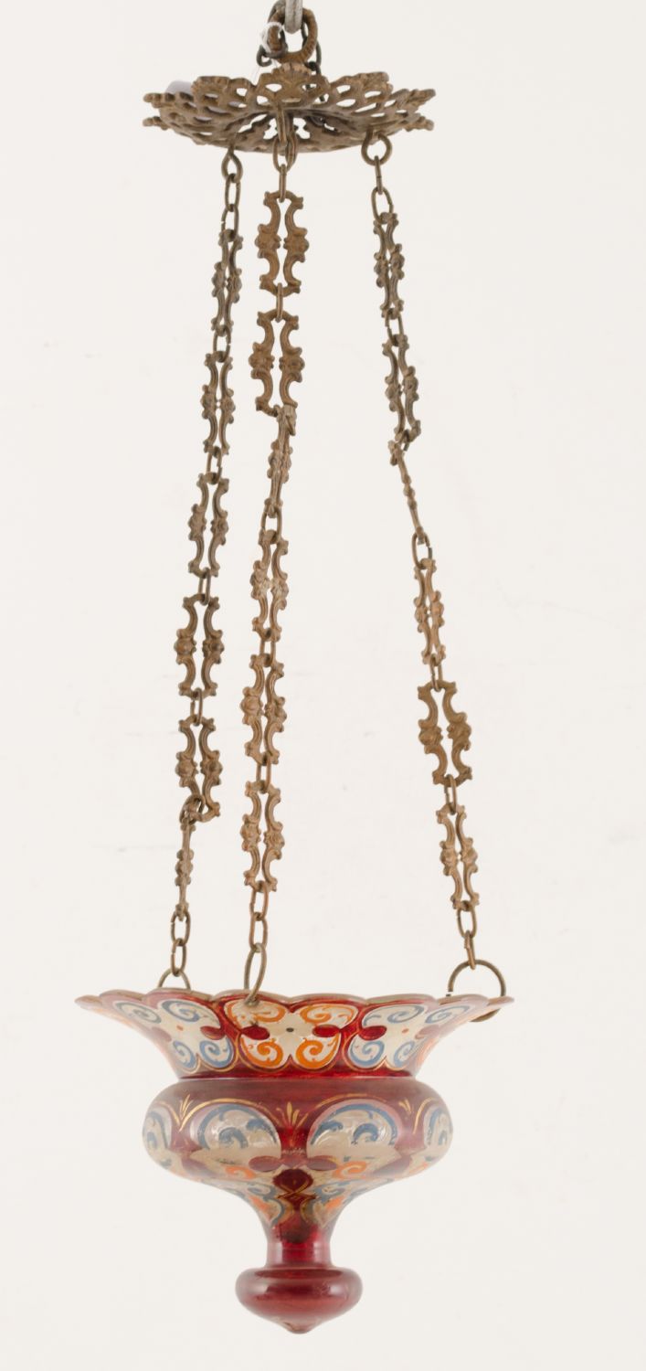LAMPADA in vetro dipinto a mano con catena in bronzo (difetti). Venezia XIX...