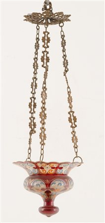 LAMPADA in vetro dipinto a mano con catena in bronzo (difetti). Venezia XIX secolo Misure: h cm 48