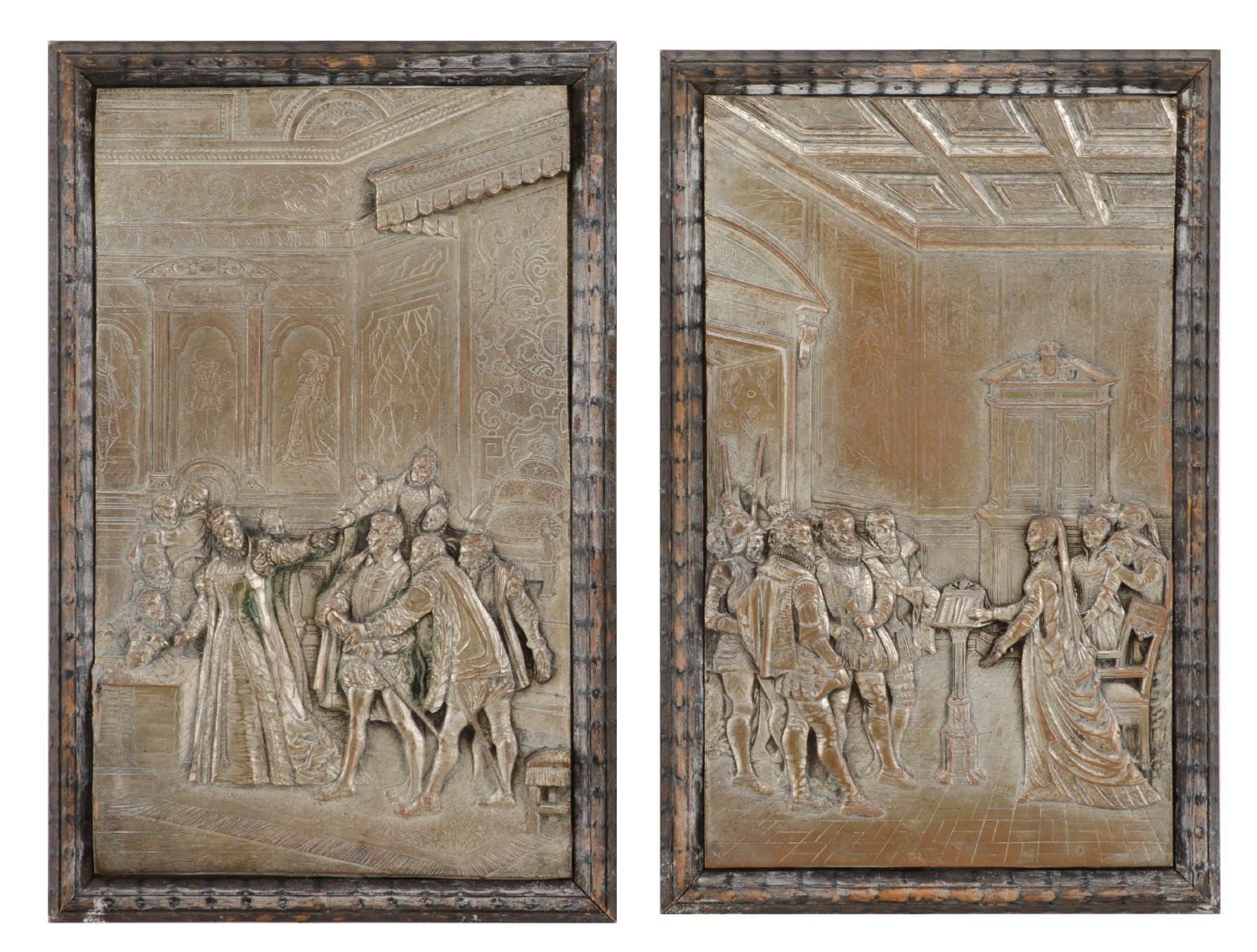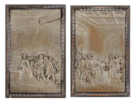 COPPIA ALTORILIEVI in metallo argentato "scene storiche". Spagna fine '800 Misure: cm 16,5 x 27