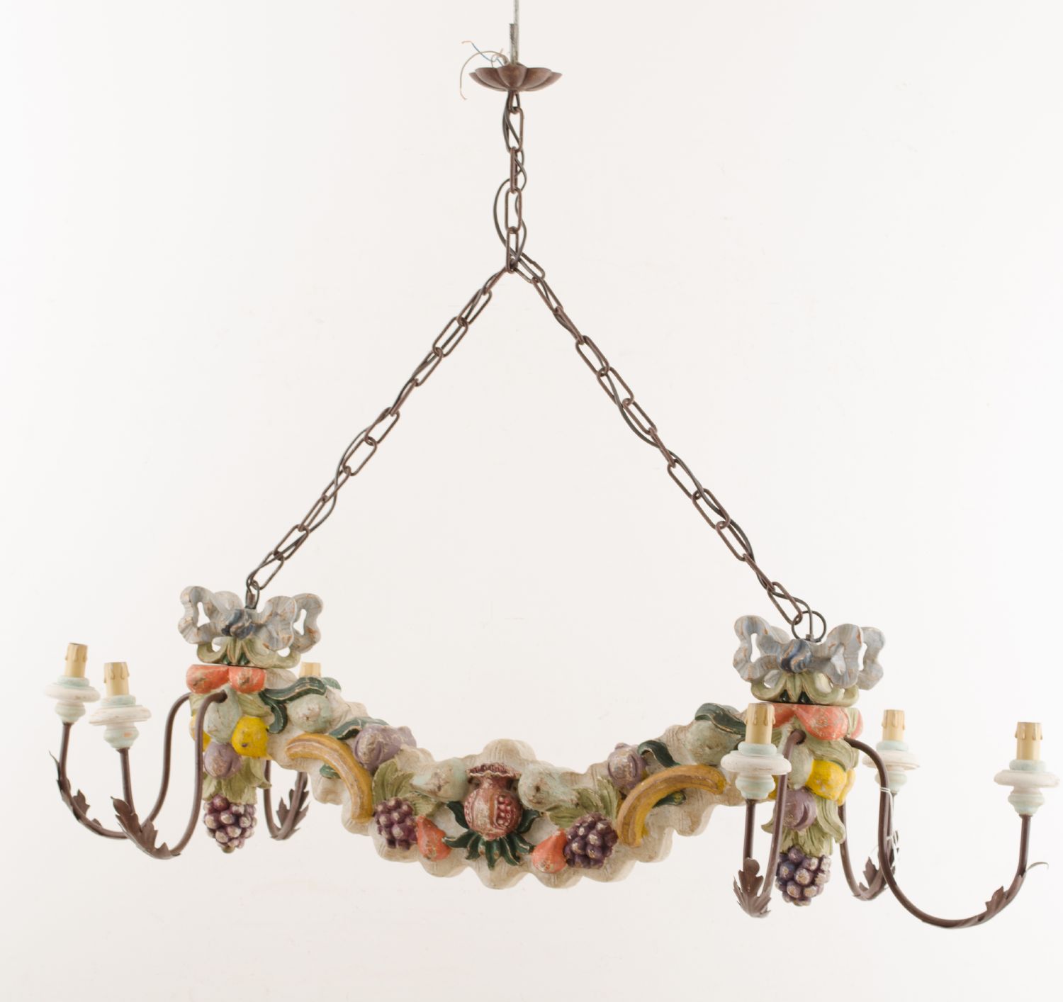 Lotto 1090 | LAMPADARIO in legno dipinto e ferro a sei luci. XX secolo Misure: h cm 90