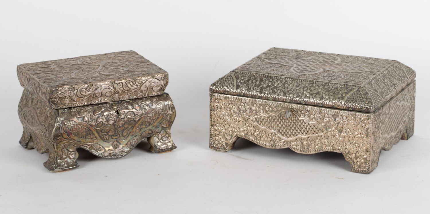 DUE SCATOLE portagioie rivestite in argento sbalzato a motivo naturalistico. XX secolo 22 x 18 x h 11-17 x 13 x h 11
