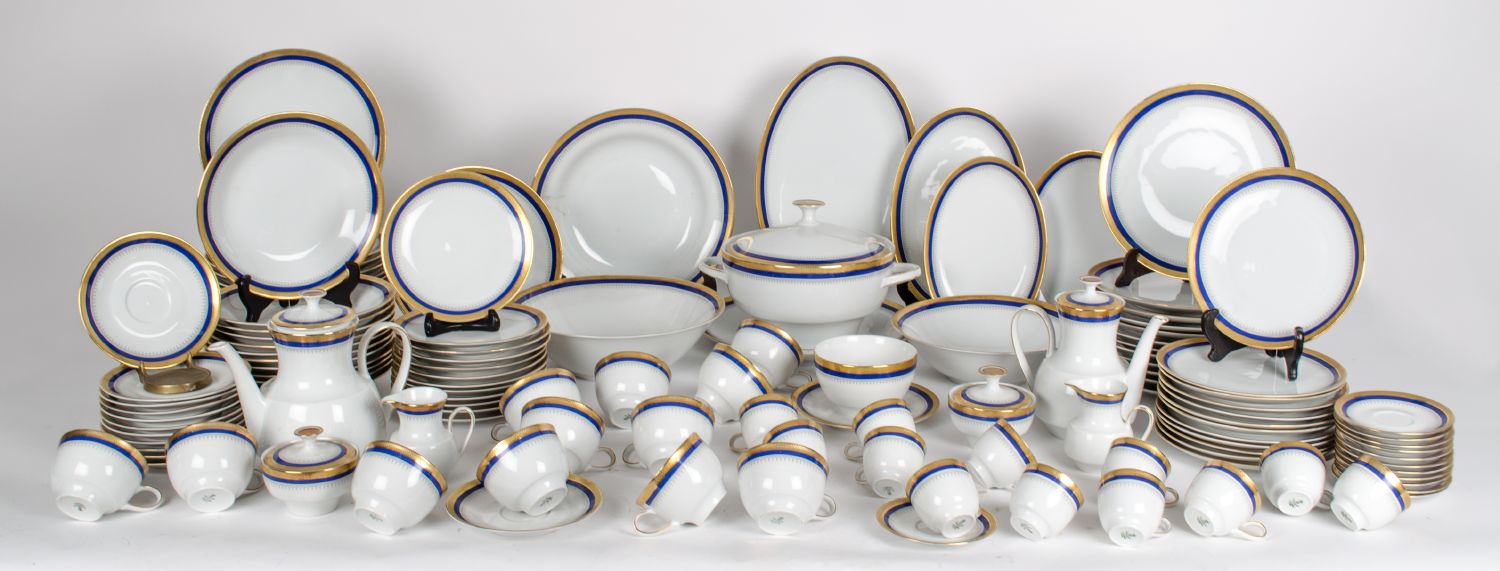SERVIZIO in porcellana Bavaria bianca con bordure blu e oro composto da ZUPPIERA, 4 PIATTI da portata, 3 INSALATIERE, 2 RAVIERE, SALSIERA, 24 PIATTI piani, 12 fondi, 12 da frutta, 12 PIATTINI da dolce, SERVIZIO da caffe e SERVIZIO da the (file'). XX secolo Misure: varie