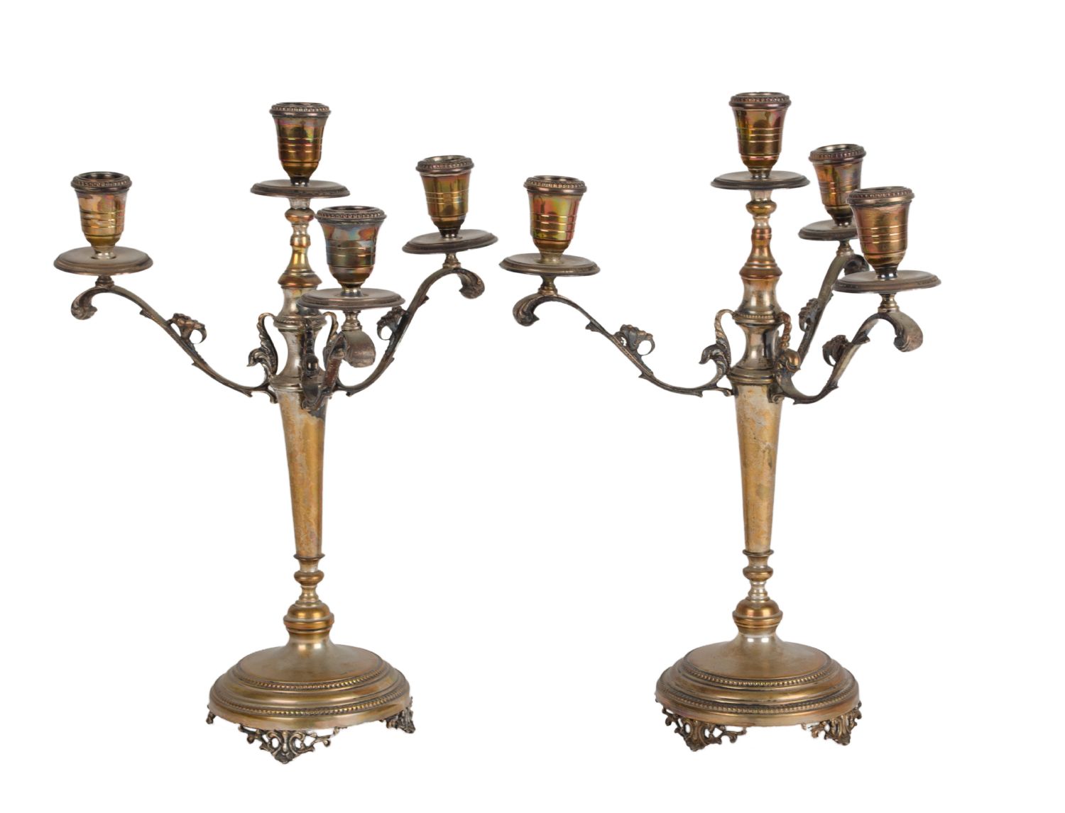 COPPIA CANDELIERI a quattro fiamme in metallo argentato. XX secolo Misure: h...