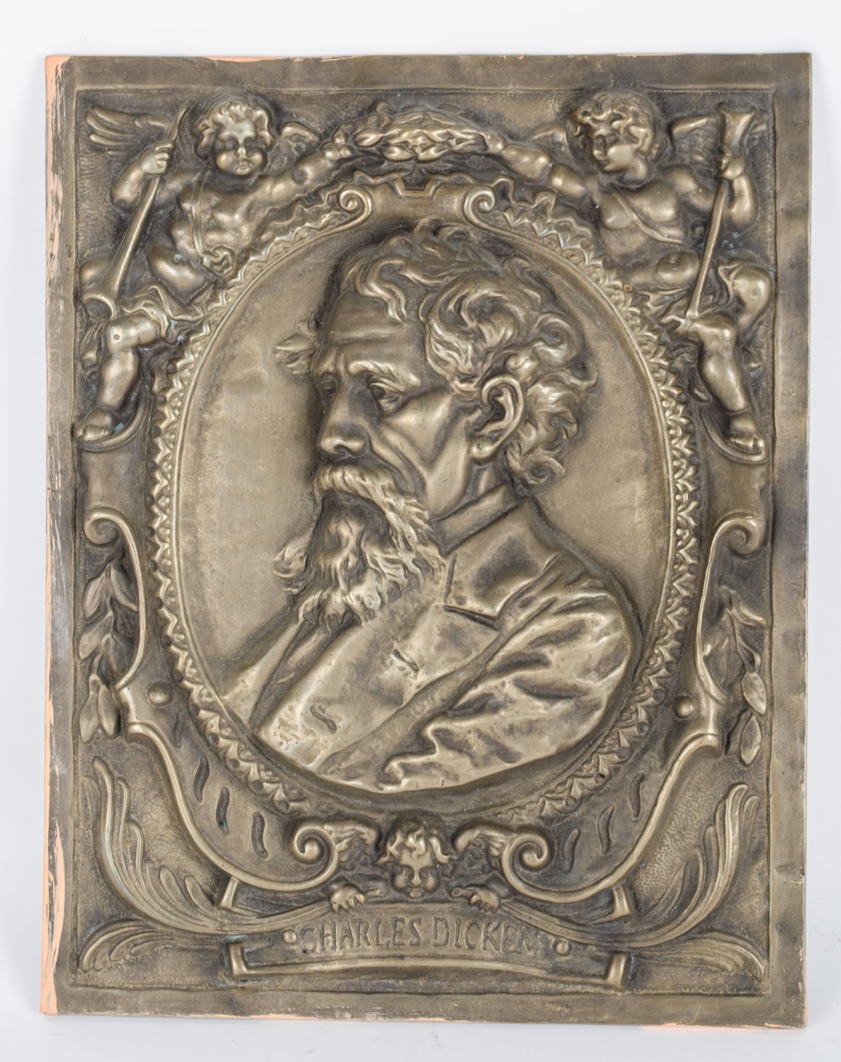 ALTORILIEVO in bronzo dorato raffigurante "ritratto di Charles Dickens". Primi '900 Misure: cm 30 x 38