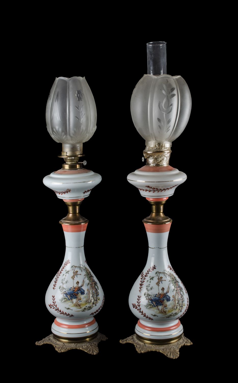 COPPIA LUMI in opaline nei toni del bianco e del salmone con lumeggiature in oro, medaglione centrale dipinto a mano raffigurante "scena bucolica", base e collo in ottone, bocce in vetro adattate (difetti, usure e mancanze). XIX secolo Misure: h cm 75