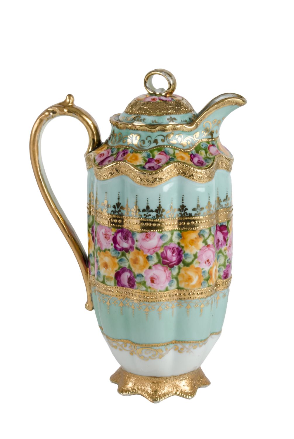CAFFETTIERA in porcellana decorata a motivo floreale, decori in oro. Primi...