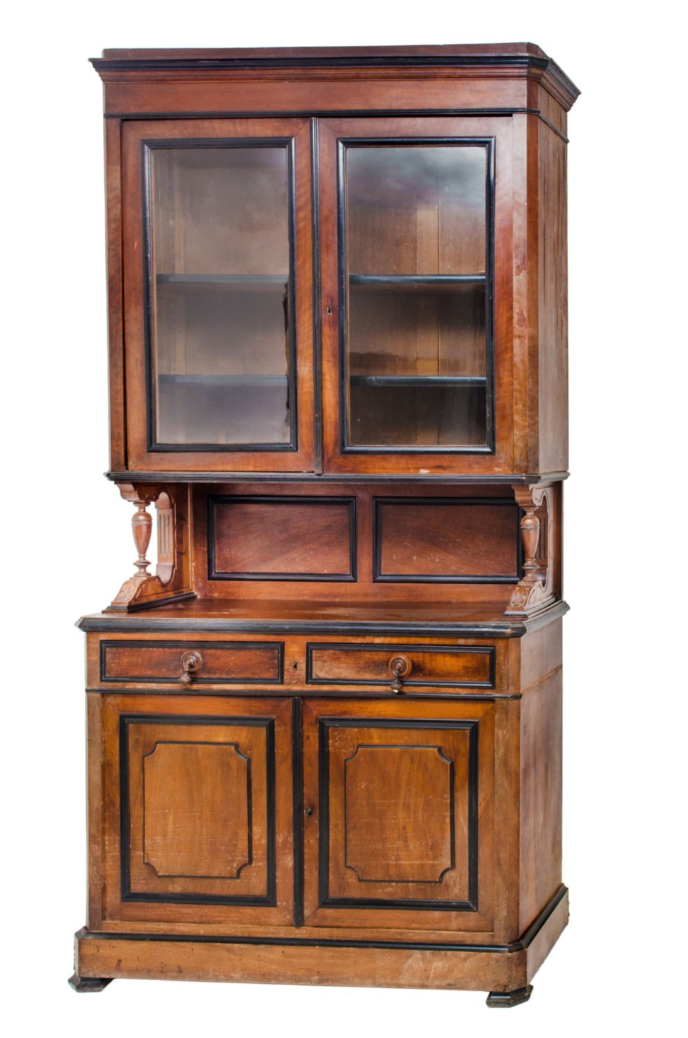 DOPPIO CORPO in noce e radica di noce con due ante superiori, due cassetti e due ante inferiori. Francia XIX secolo Misure: cm 130 x 52 x h 243