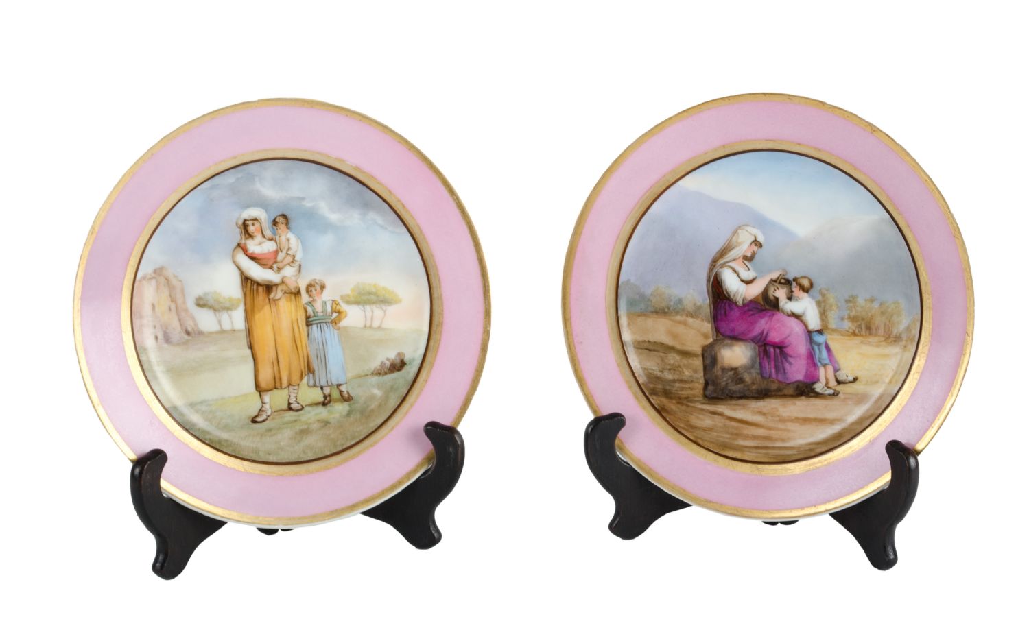 COPPIA PIATTI in porcellana decorata nei toni del rosa con medaglione raffigurante "madre con figli". XIX secolo Misure: diametro cm 19,5