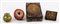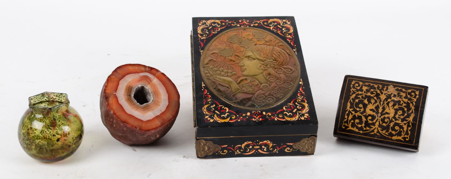 LOTTO composto da due COFANETTI in legno, VASETTO in vetro e da TRONCO FOSSILE (ferma carte). XX secolo Misure: varie