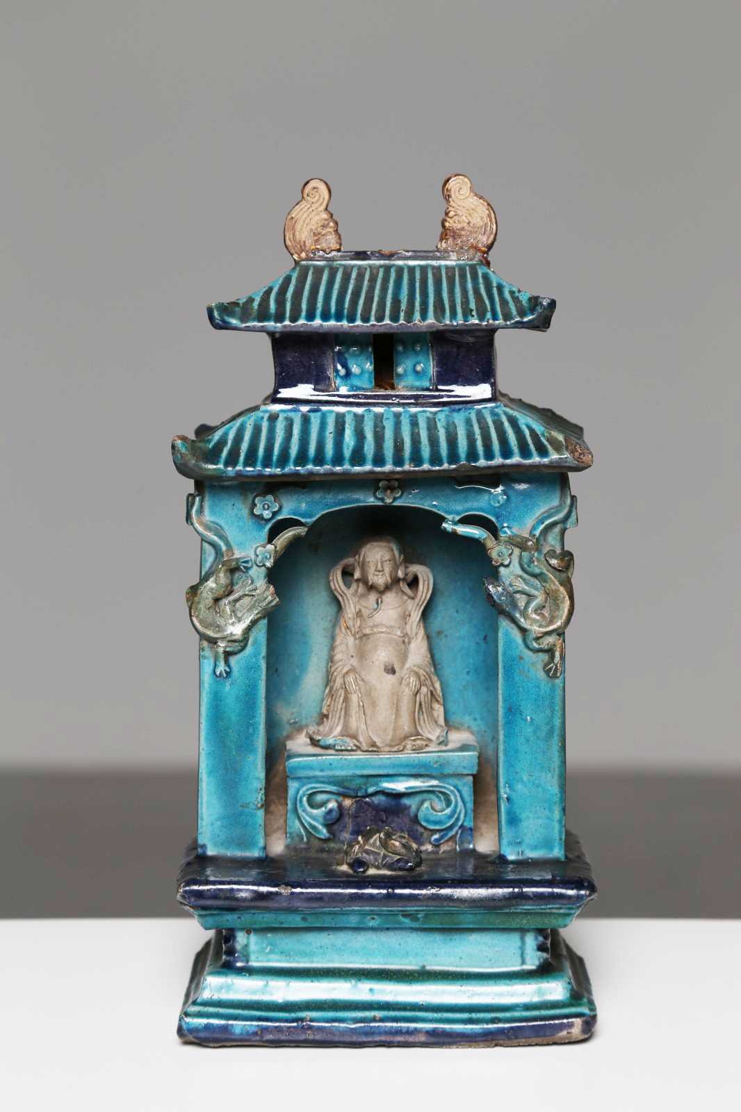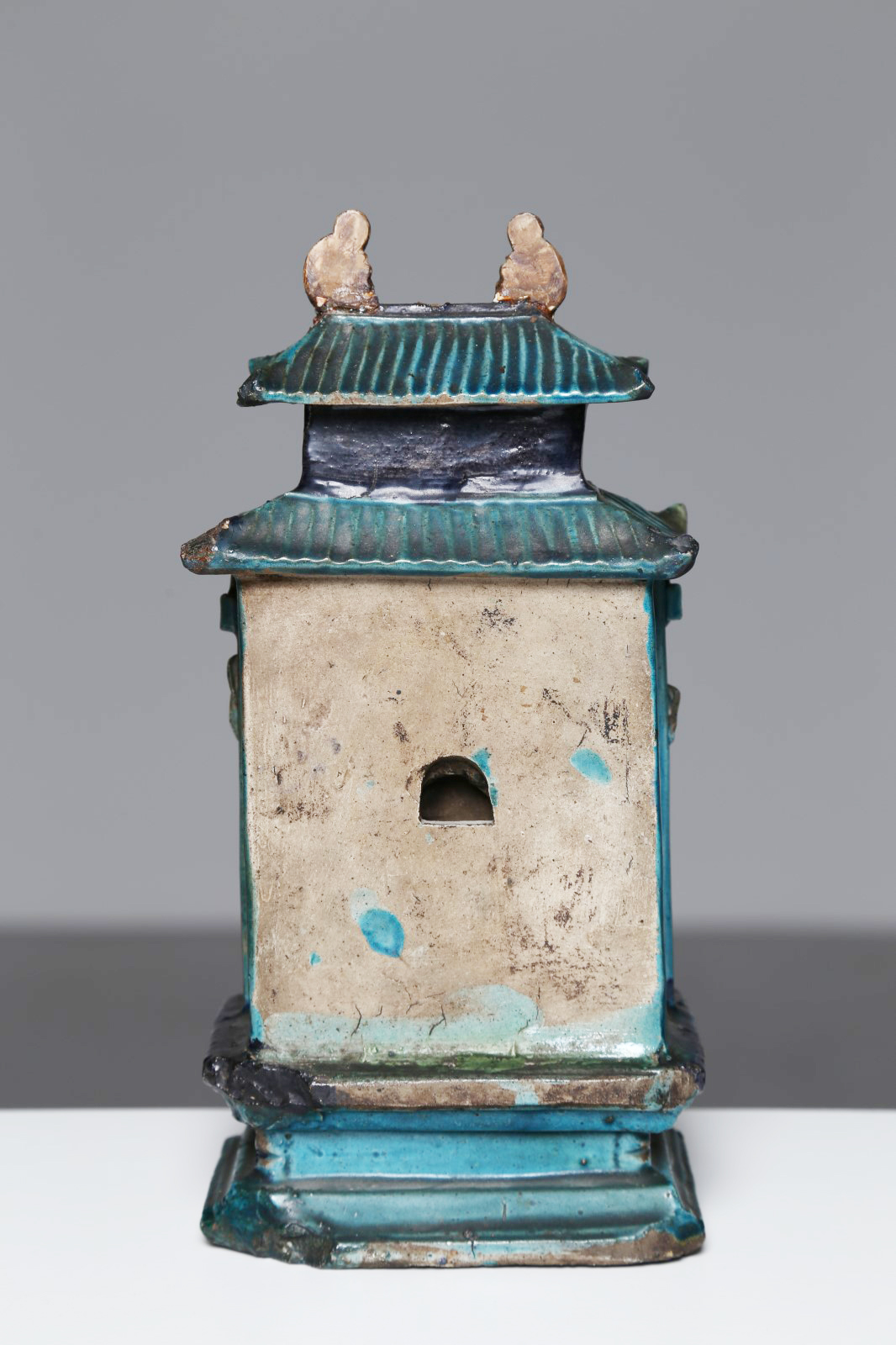 Arte Cinese Modello di pagoda in terracotta invetriata di turchese con figura centrale Cina, dinastia Ming, XVI secolo. . Cm 14,00 x 30,00 x 9,00. Modellino di edificio in porcellana invetriata con figura assisa centrale ed animali benaugurali sui lati.