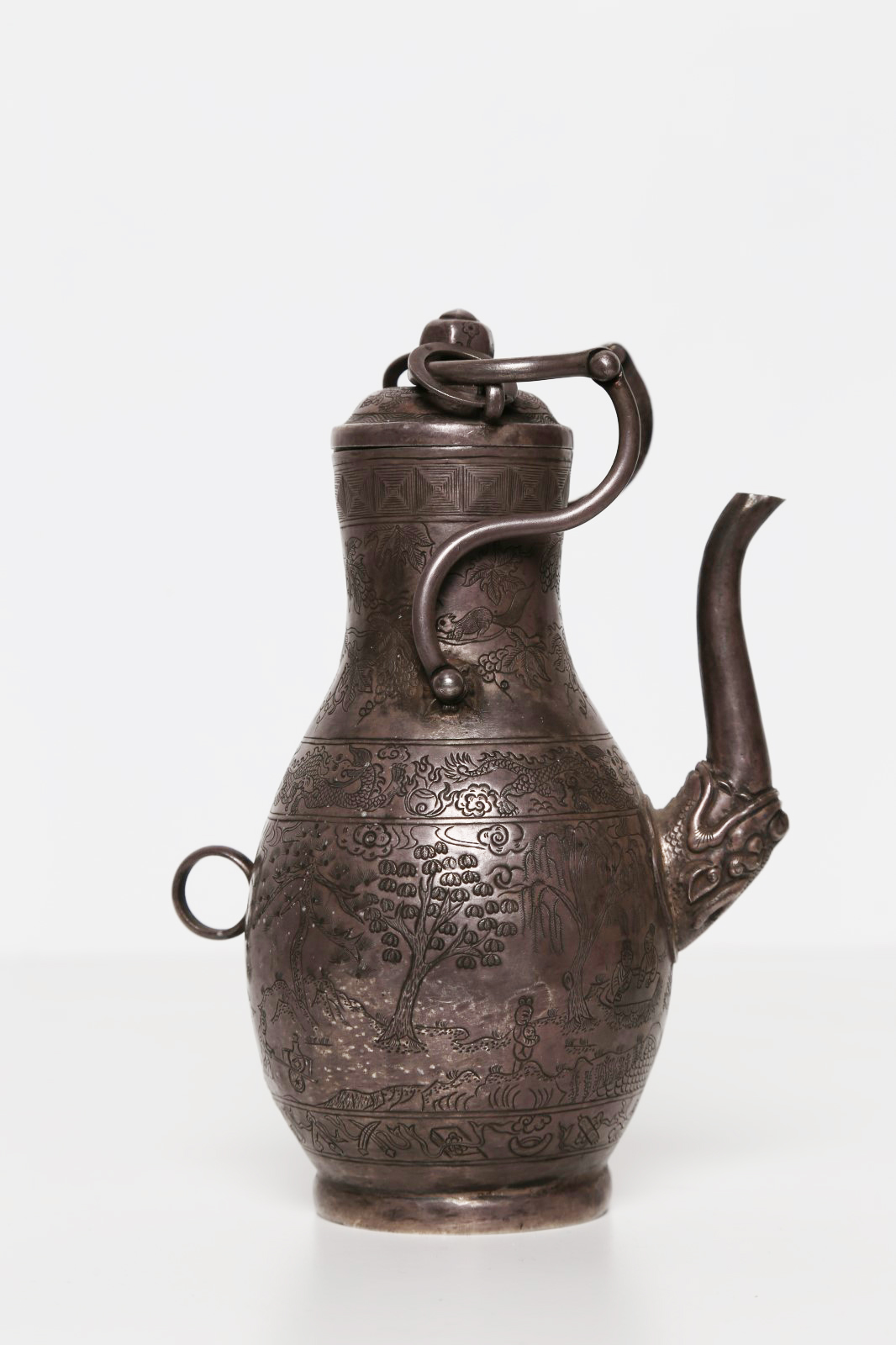 Arte Cinese Versatoio in argento inciso Cina, dinastia Qing, periodo Qianlong, 1736 - 1795. -. Cm 18,50. Il versatoio presenta il corpo a forma di oliva, la bocca curva decorata con una testa di drago, il manico a forma si S tenuto in sede da due cerchi e la superficie profusamente decorata con vari motivi: scoiattoli tra grappoli d'uva sul collo; dragoni all'inseguimento della perla fiammeggiante nella fascia appena sottostante e scene di persone impegnate in varie attività in esterno sul corpo centrale. Per un esemplare comparativo si veda quello conservato al Palace Museum di Pechino.