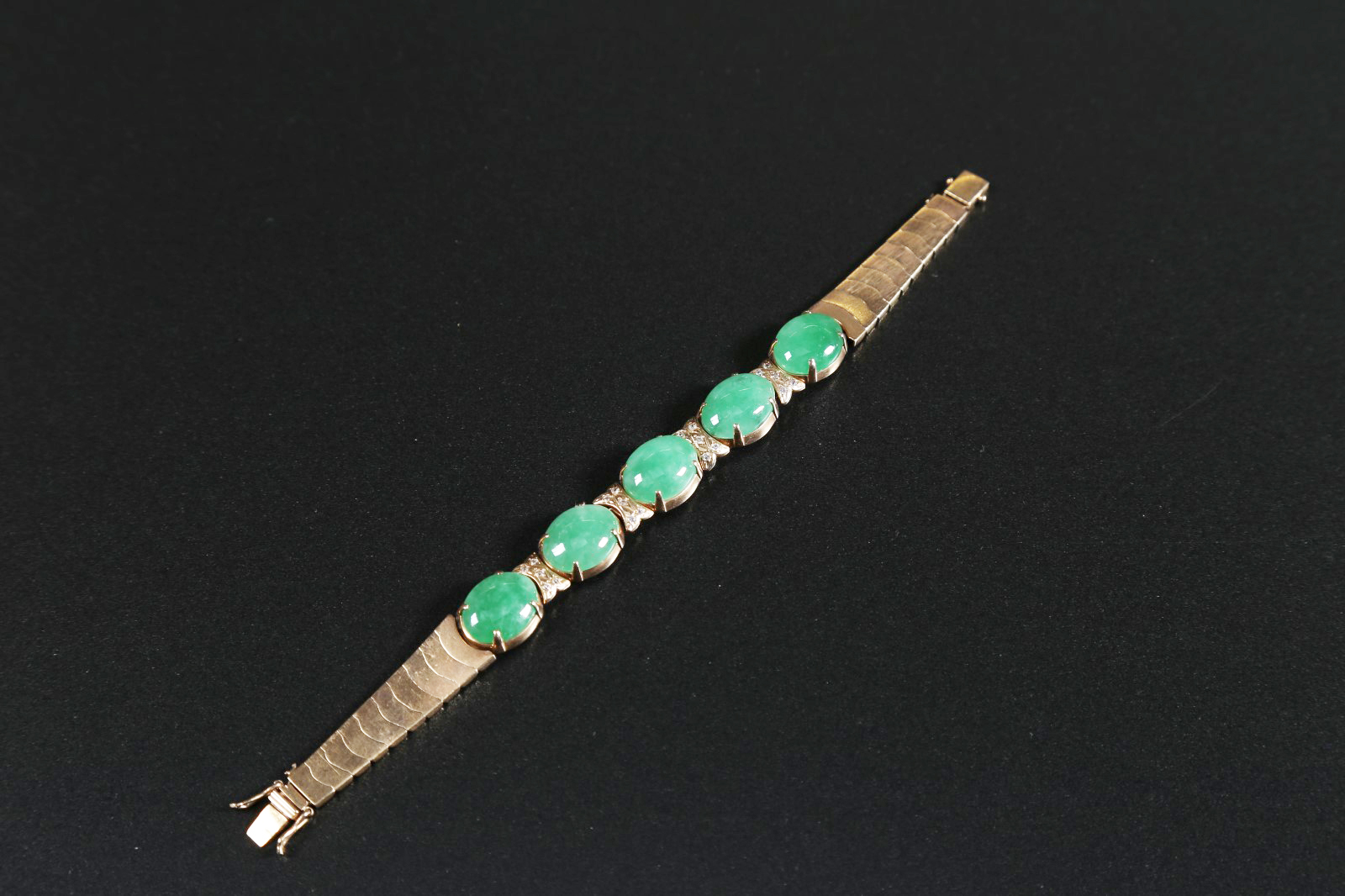 Arte Cinese Bracciale in oro, diamanti e giadeite Cina/Europa, XX secolo. -. Cm 19,00. Bracciale in oro con cinque ovali di giadeite incastonati, inframezzati da placche a forma di X contenenti cinque piccoli diamanti.