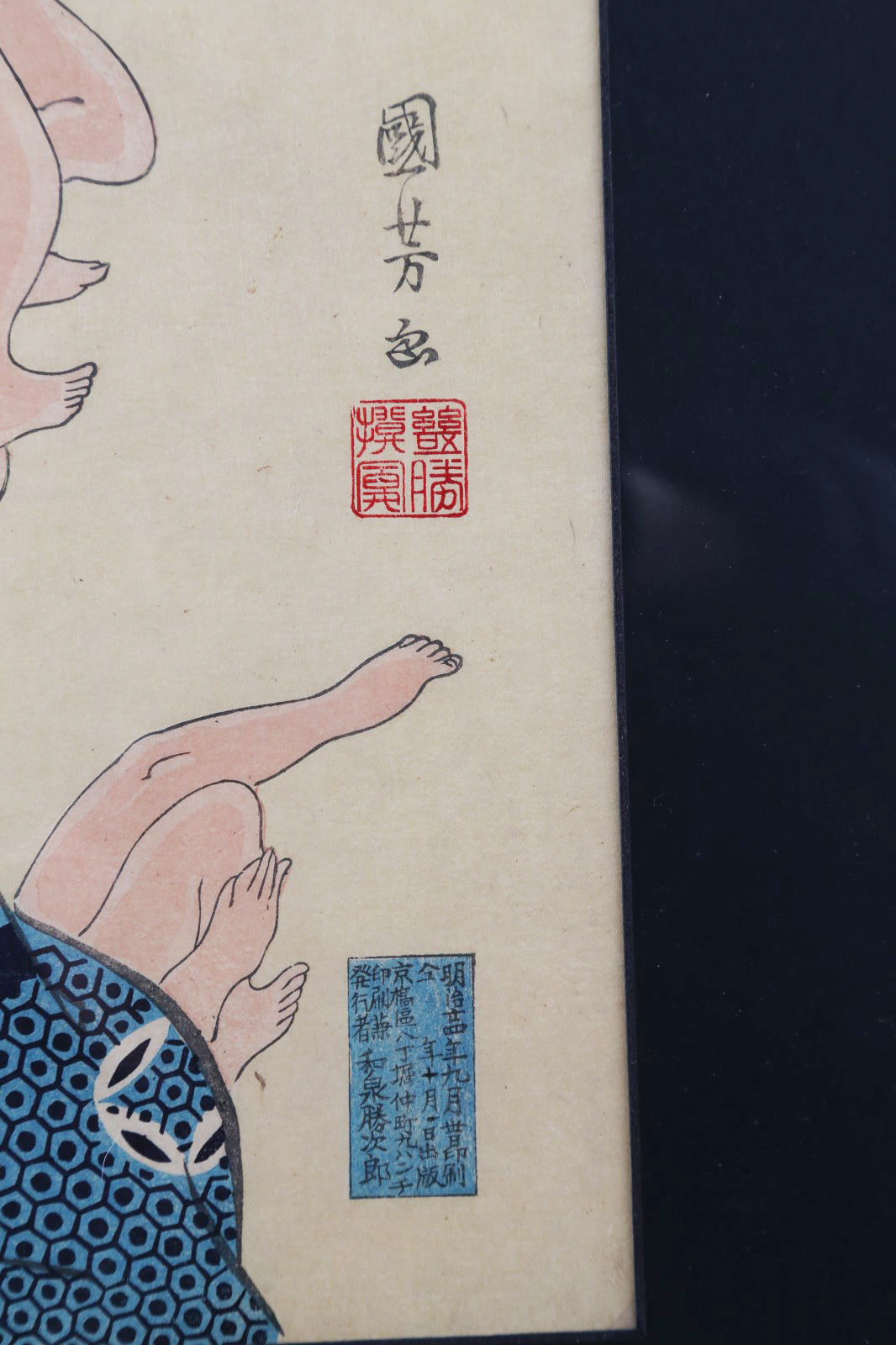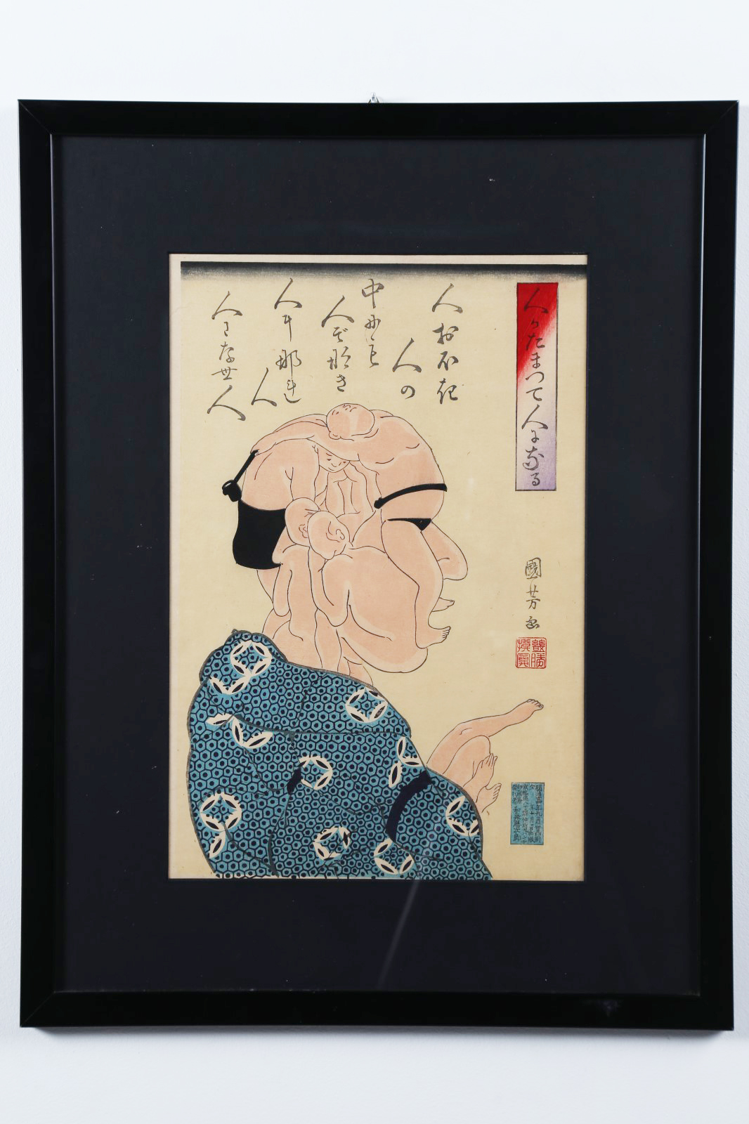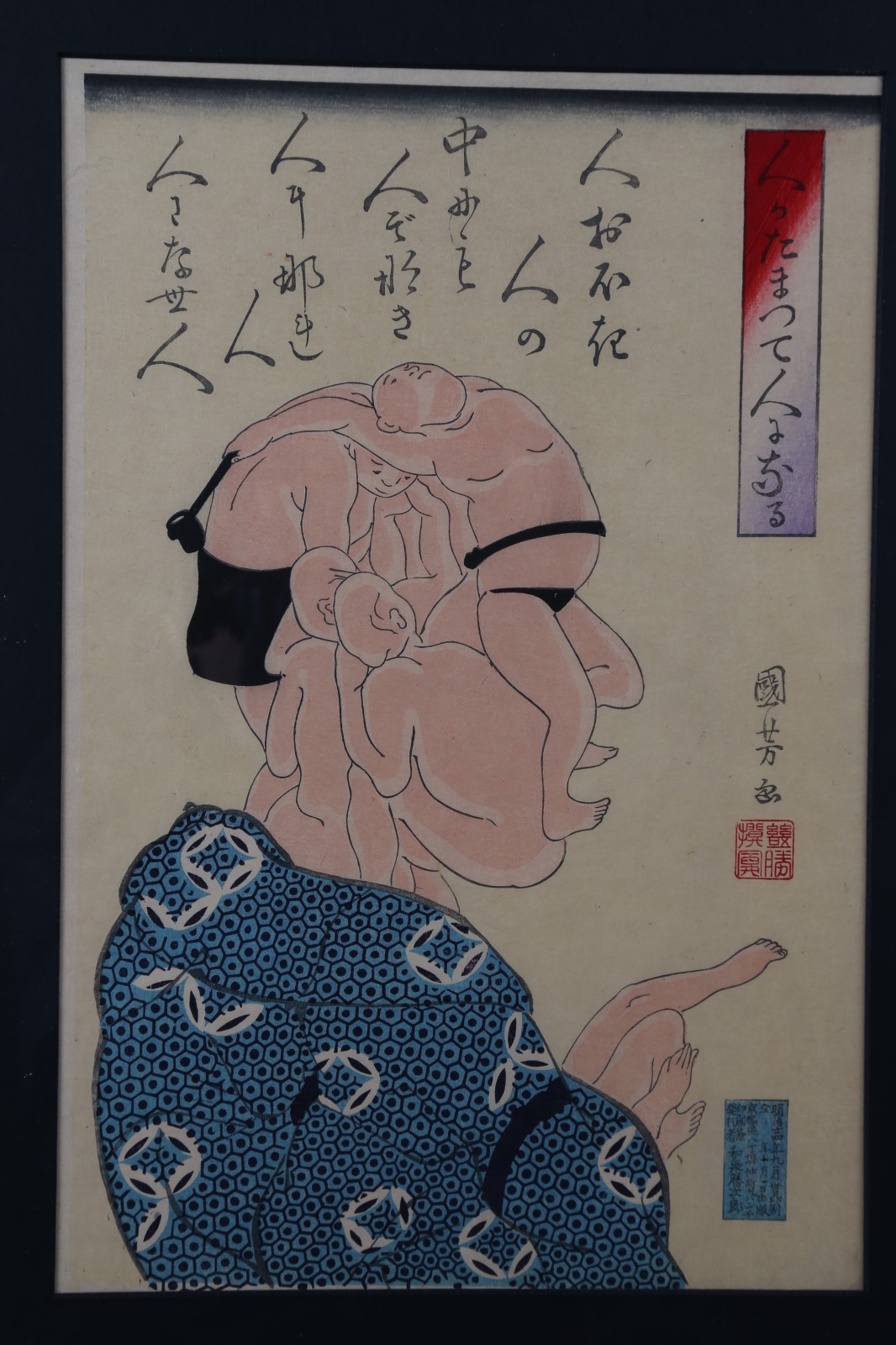 Arte Giapponese Utagawa Kuniyoshi (1798 - 1861) Persone assemblate per formare un ritratto Giappone, periodo Meiji, 1881 Xilografia policroma. -. Cm 41,00 x 53,00. Stampa raffigurante figure umane che si compongono a formare un viso. Nella calligrafia in alto si legge un componimento poetico di tipo moralistico, mentre il titolo dell'opera è presente nel cartiglio in alto a destra, sopra la firma ed il sigillo dell'artista. Questa stampa fa parte di una serie di quattro ritratti senza titolo. Entro passpartout nero e cornice moderna nera. Le dimensioni della sola stampa sono: l. 24 X h. 36 cm