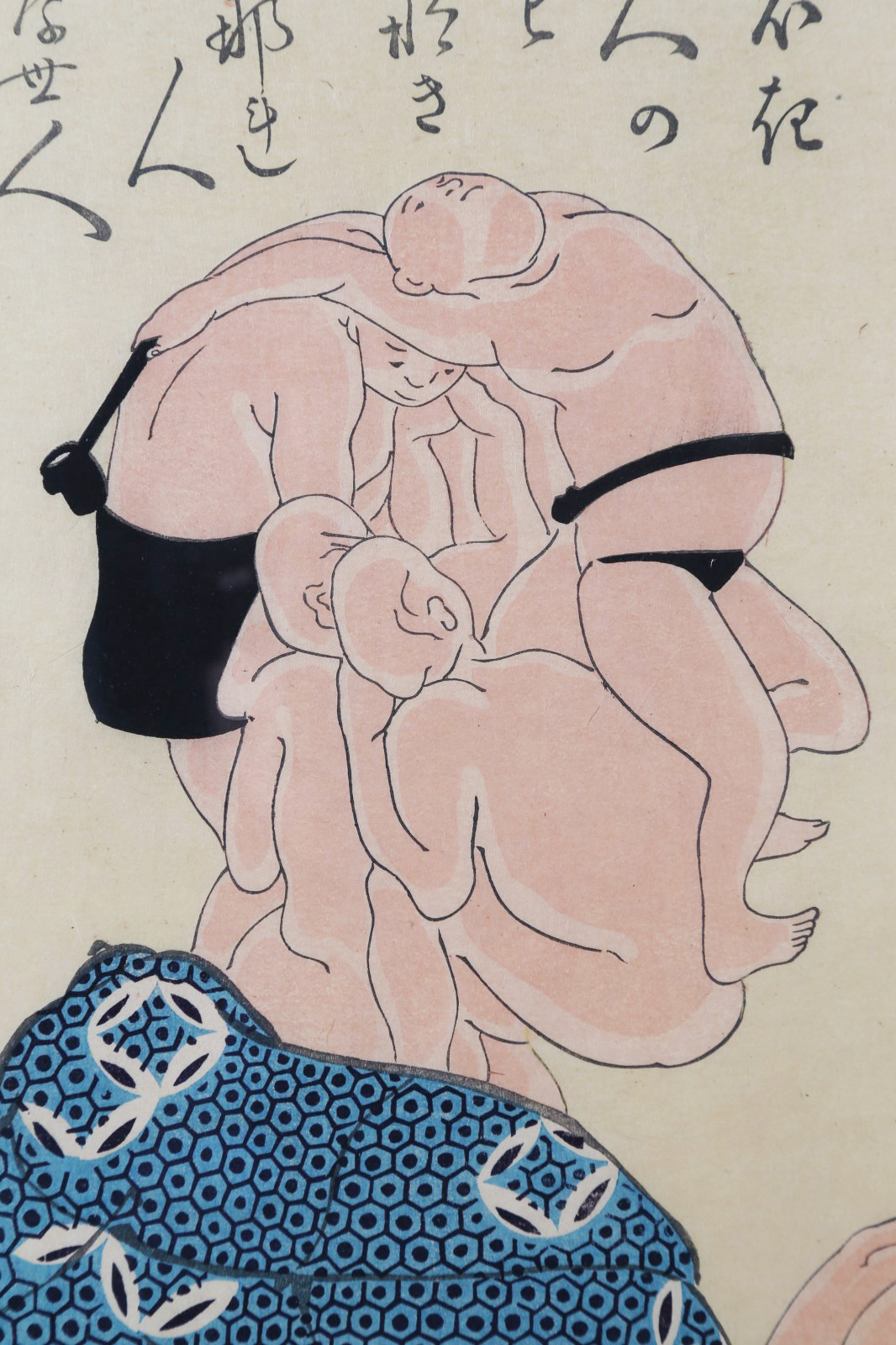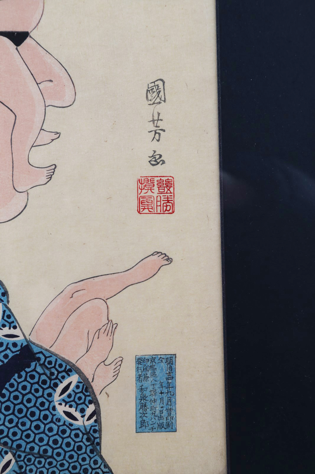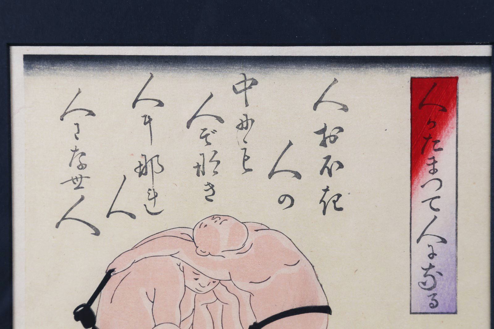 Arte Giapponese Utagawa Kuniyoshi (1798 - 1861) Persone assemblate per formare un ritratto Giappone, periodo Meiji, 1881 Xilografia policroma. -. Cm 41,00 x 53,00. Stampa raffigurante figure umane che si compongono a formare un viso. Nella calligrafia in alto si legge un componimento poetico di tipo moralistico, mentre il titolo dell'opera è presente nel cartiglio in alto a destra, sopra la firma ed il sigillo dell'artista. Questa stampa fa parte di una serie di quattro ritratti senza titolo. Entro passpartout nero e cornice moderna nera. Le dimensioni della sola stampa sono: l. 24 X h. 36 cm