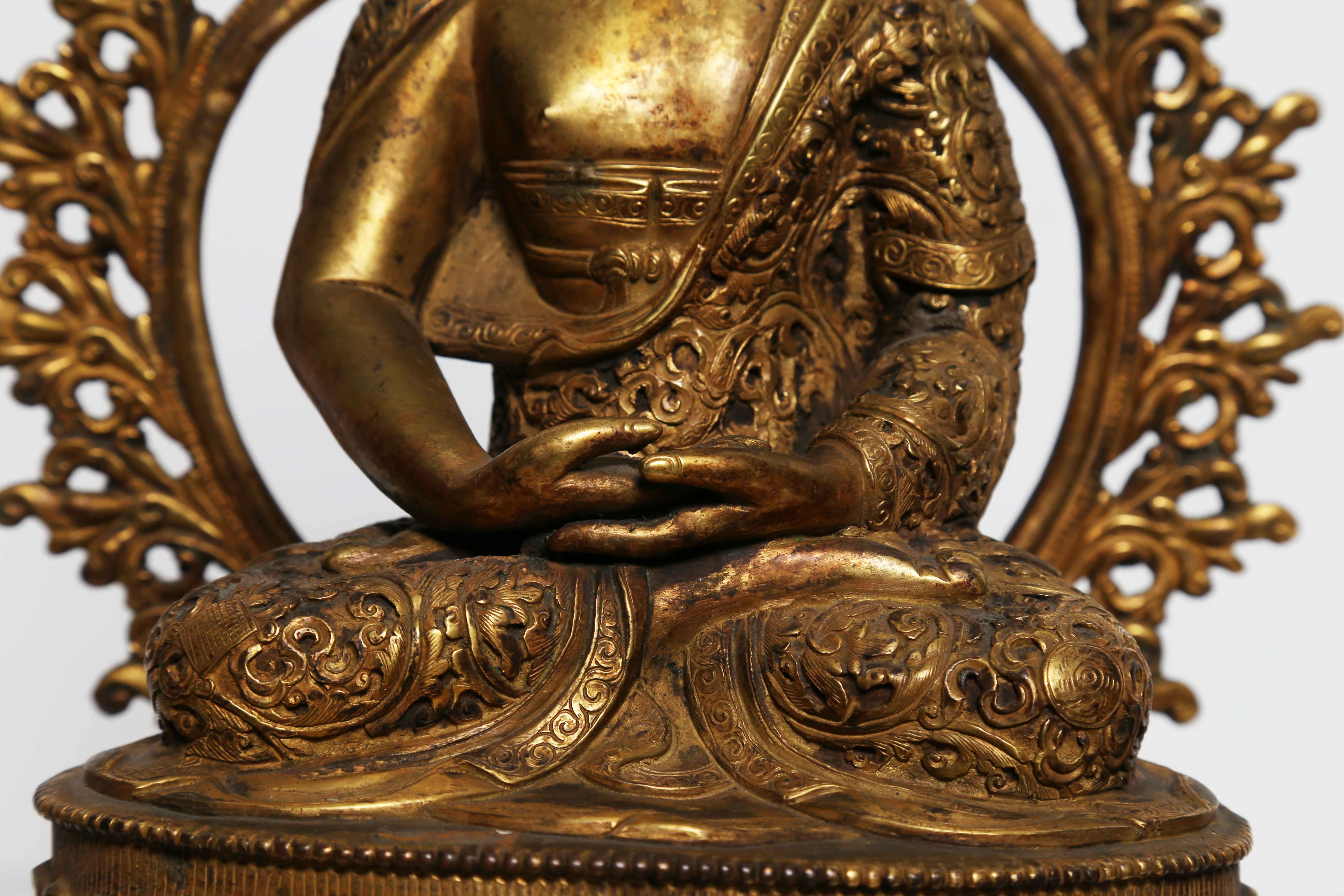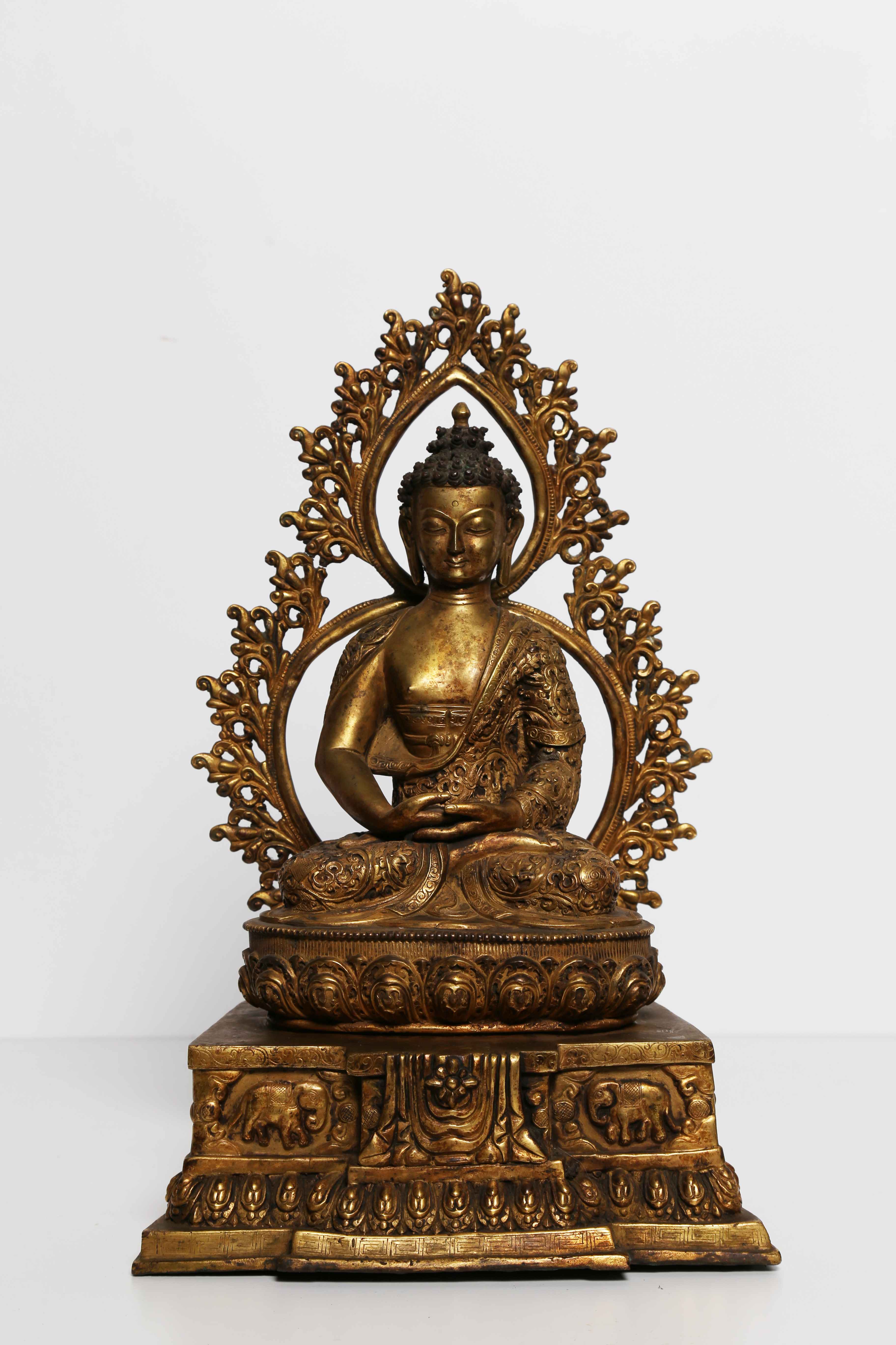 Arte Himalayana Imponente statua in bronzo dorato raffigurante Amitabha Tibet, prima metà XX secolo. -. Cm 27,00 x 47,50 x 18,00. Su alta base poligonale decorata a motivo vegetale e con due elefanti siede il Buddha trascendente Amitabha su base di loto; le gambe nella posizione del loto, le mani in dhyani mudra, la ricca veste e l'aureola fiammeggiante amovibile.