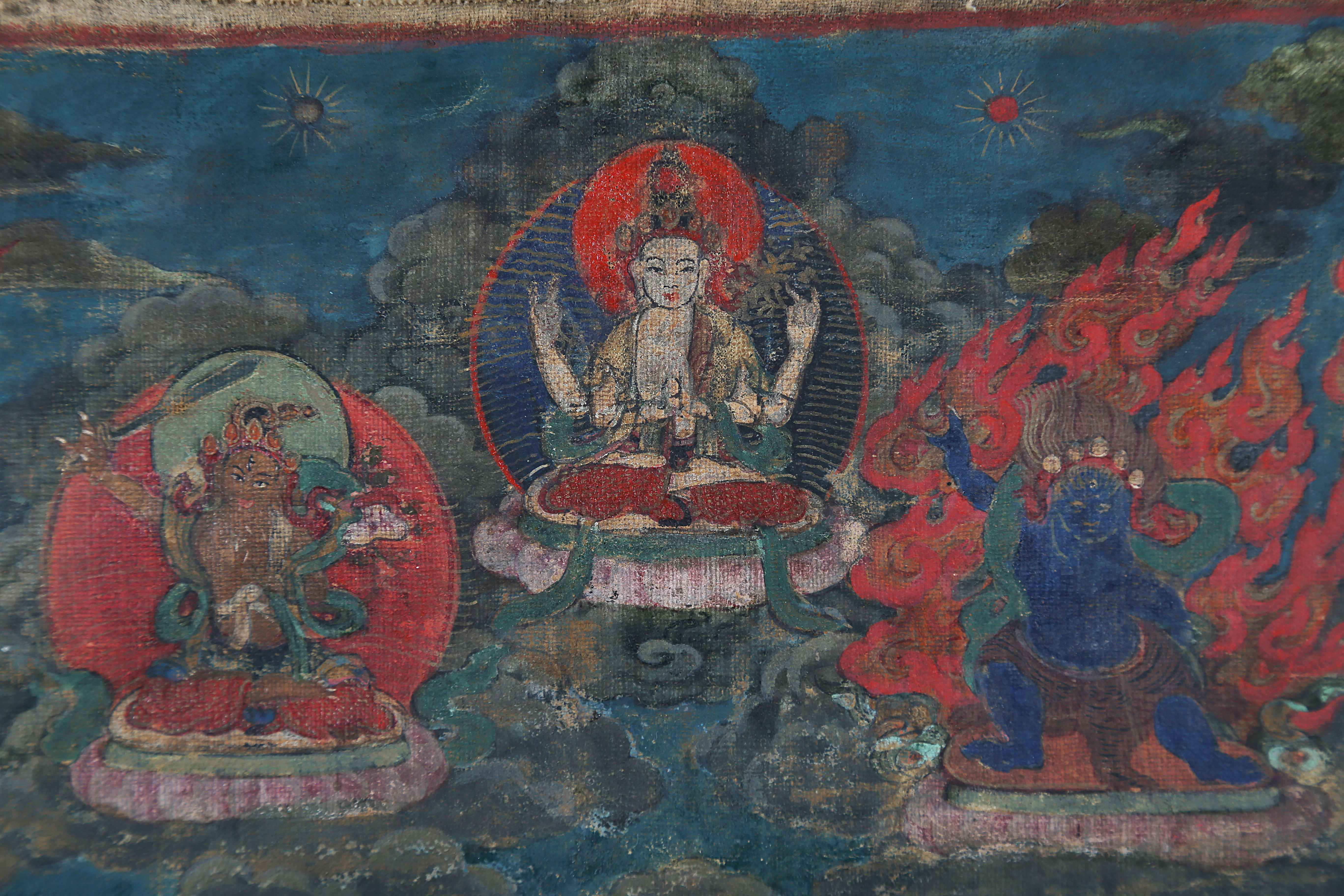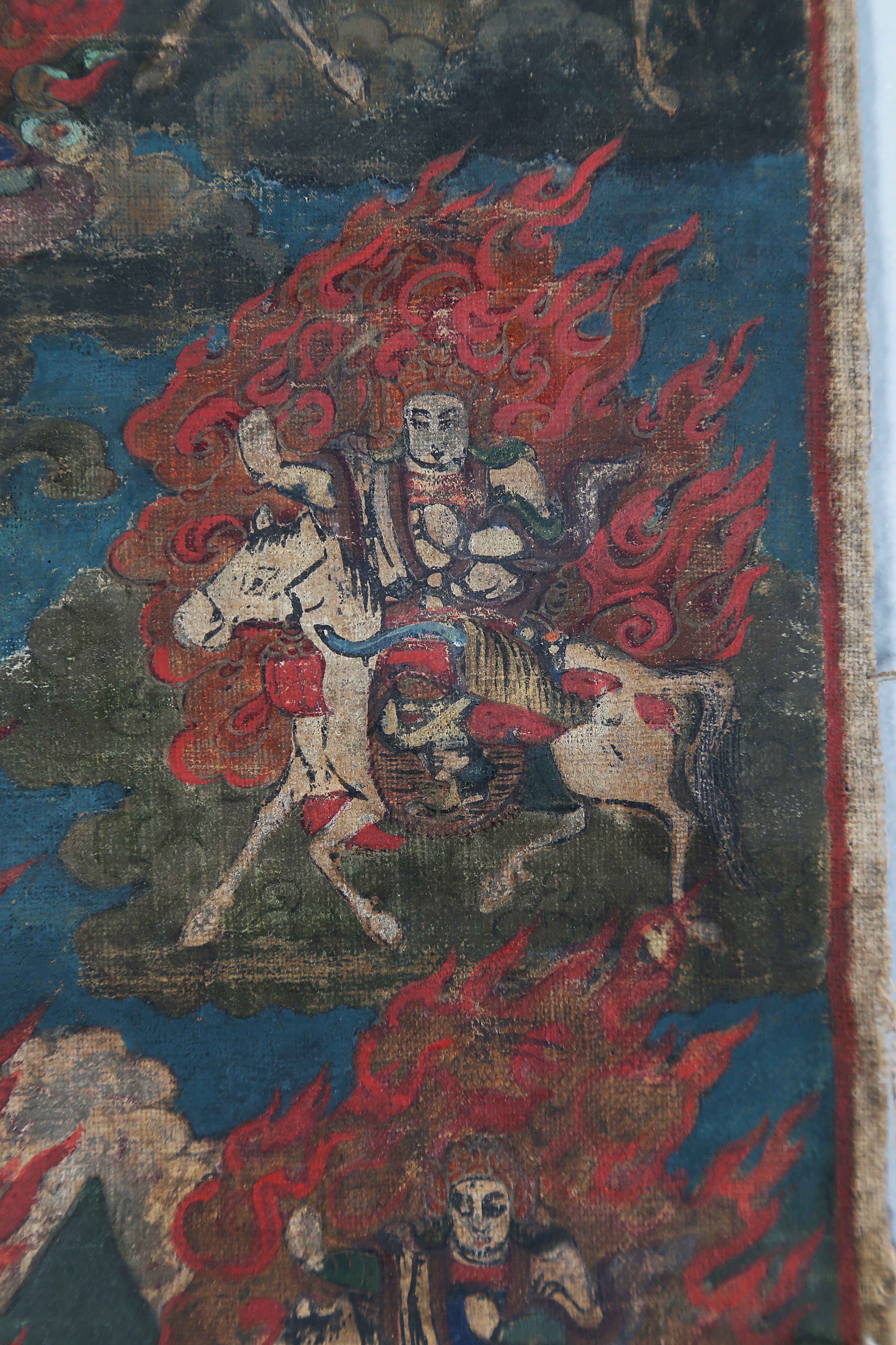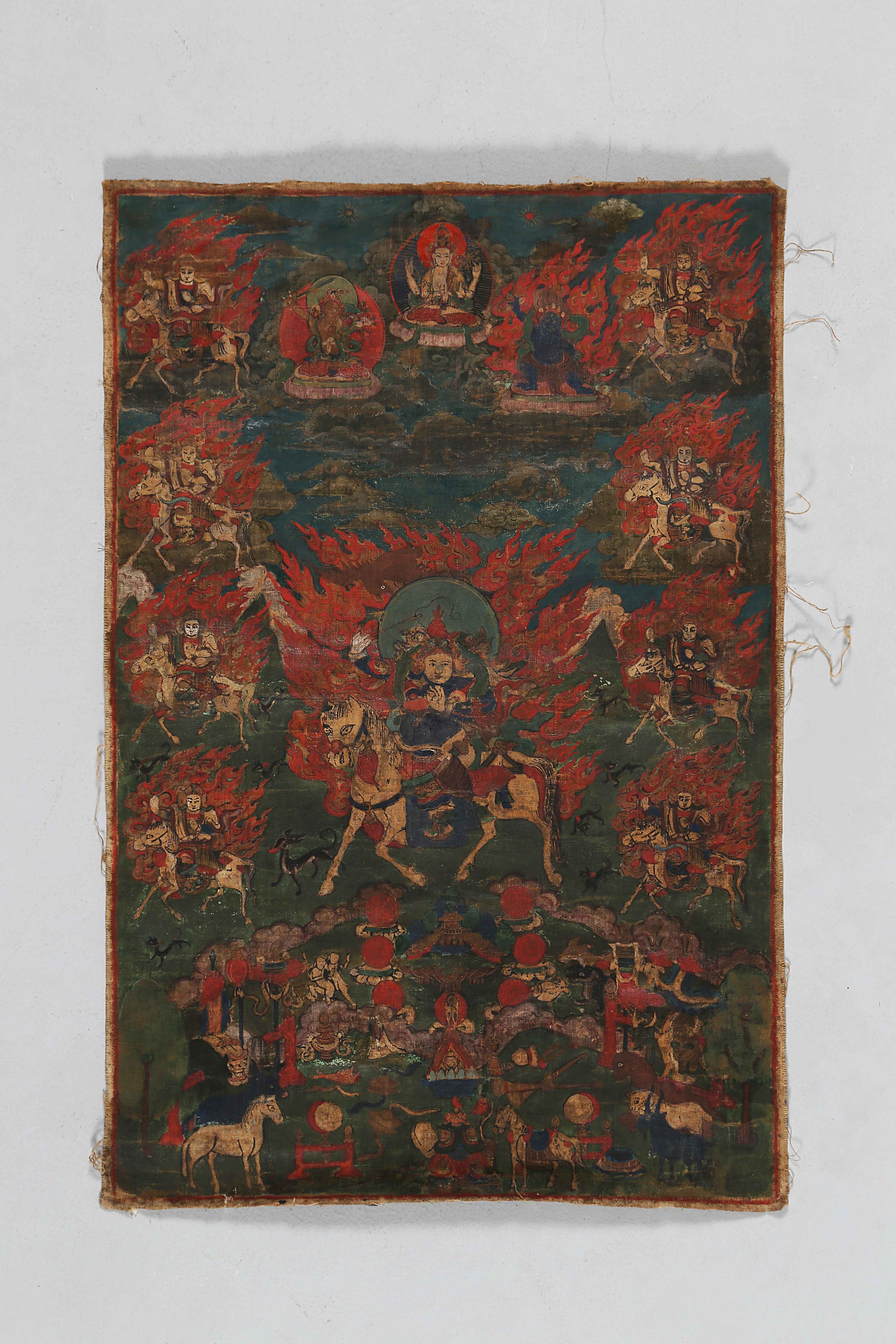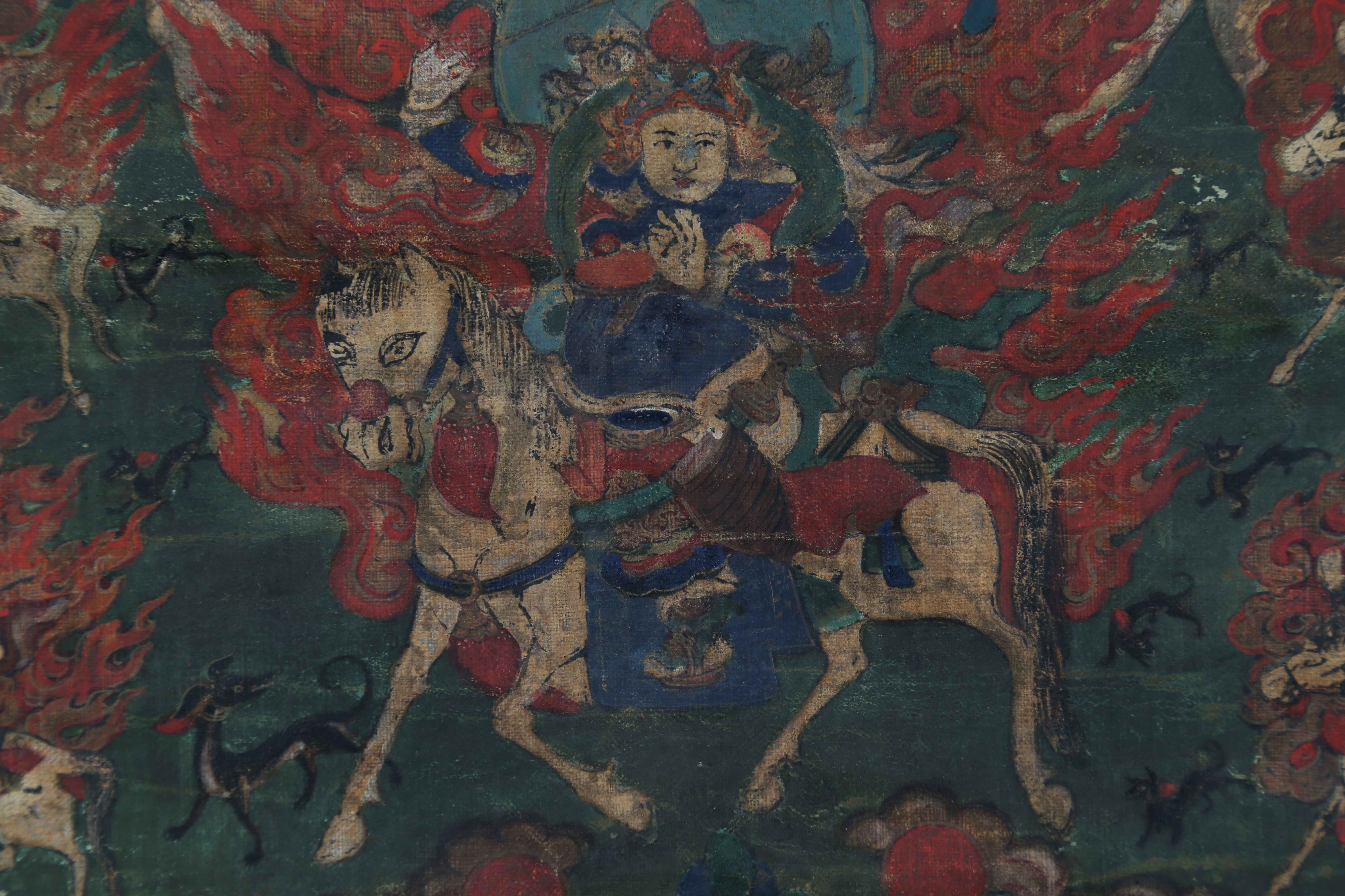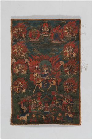 Arte Himalayana Thangka raffigurante Gesarling Tibet, fine XVIII - inzio XIX secolo . . Cm 40,00 x 61,00. Danni.
