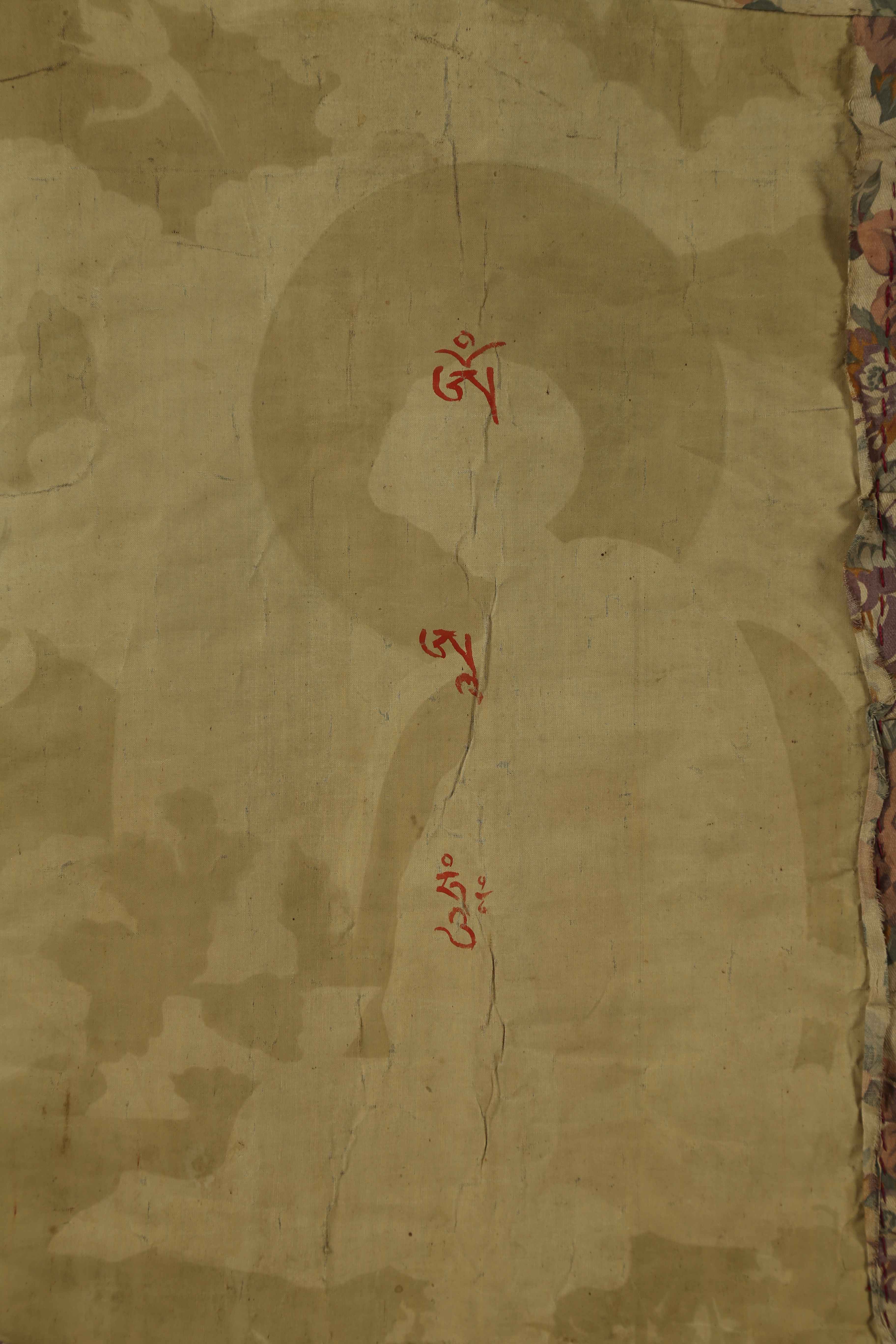 Arte Himalayana Thangka raffigurante un Arhat Cina/TIbet, XIX secolo. -. Cm 39,50 x 58,00. Thangka raffigurante Vajriputra, uno dei 18 arhat (colui che ha raggiunto l'illuminazione tramite gli insegnamenti del maestro), realizzata con colori tenui mostra il personaggio principale con lo scacciamosche, attributo che lo contraddistingue. Intorno alla figura si sviluppa un paesaggio agreste con cicogne e nuvole spumose stilizzate. Da notare, oltre alla presenza dell'attivazione sul retro (Om Ah Hum), la cornice originale in broccato di seta. Misure con la cornice: 125 X 67 cm
