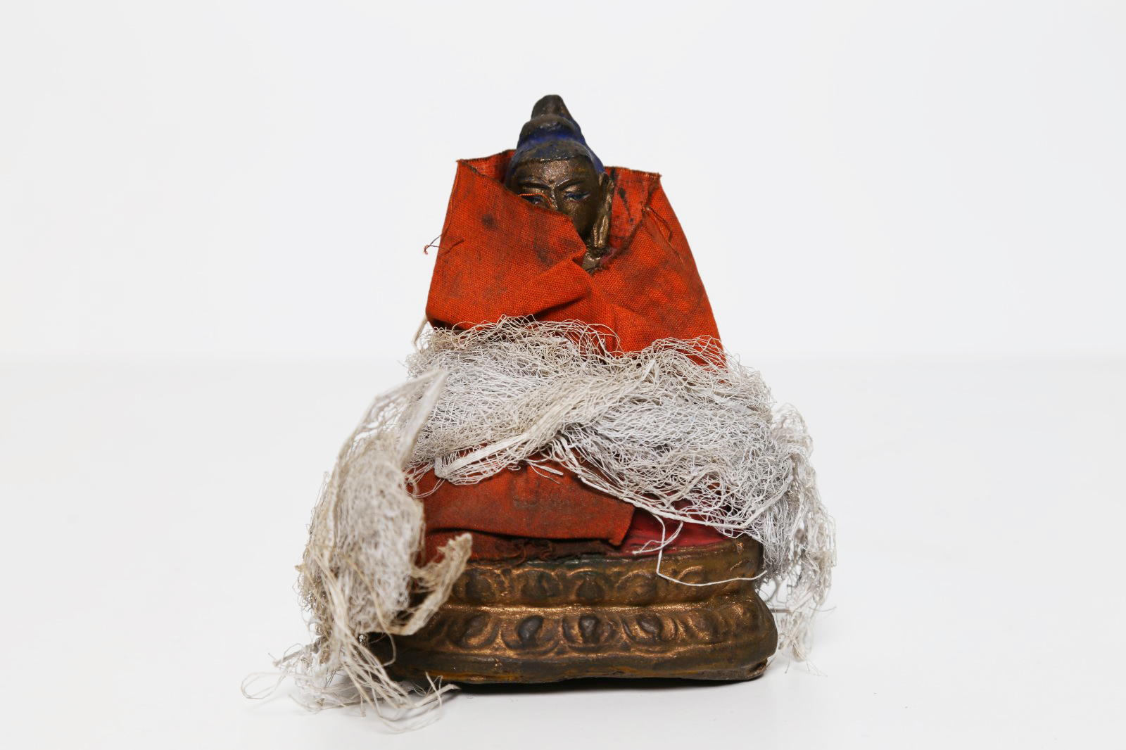 Arte Himalayana Piccola scultura in stucco policromo raffigurante Buddha con copertura sacra in tessuto Tibet, inizi XX secolo . -. Cm 7,60 x 12,50.
