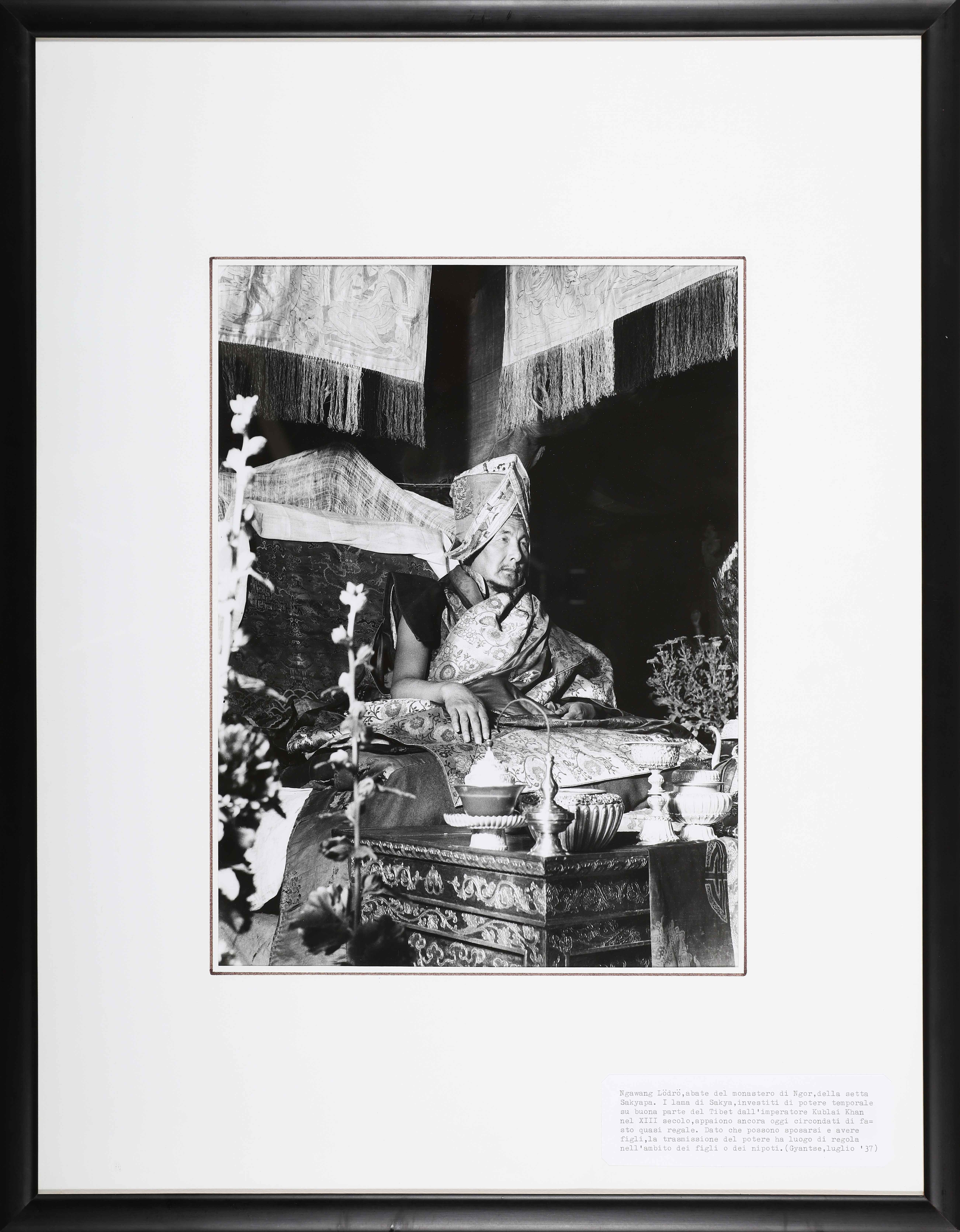 Arte Himalayana Fosco Maraini (1912 - 2004) Fotografia raffigurante l'abate del monastero di Ngor. Tibet, Gyantse, luglio 1937. 1937. . Cm 48,00 x 64,00. Fotografia raffigurante l'abate della setta Sakyapa. I lama Sakya, investiti di potere temporale su buona parte del Tibet dall'imperatore Kublai Khan nel XIII secolo, appaiono ancora oggi circondati di fasto quasi regale. Dato che possono sposarsi ed avere figli, la trasmissione del potere ha luogo di norma nell'ambito dei figli o dei nipoti. No crediti. Dimensione lastra: 39 x 28 cm. Cornice presente