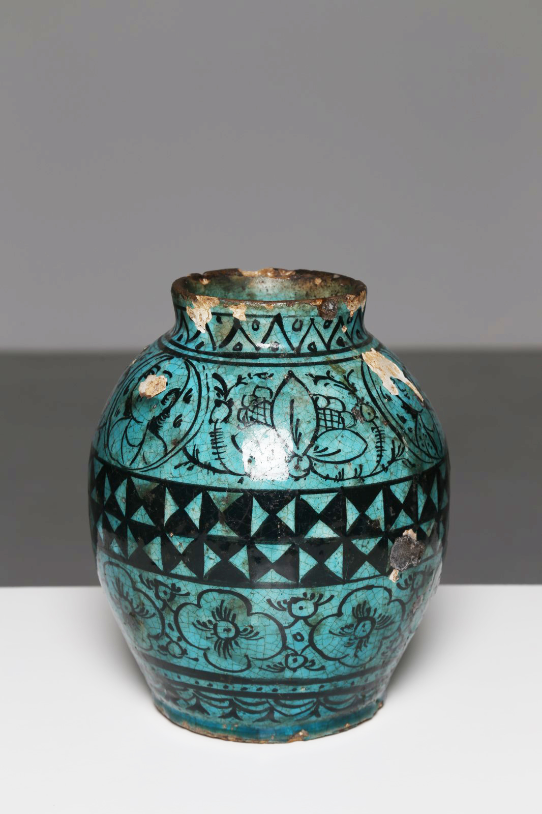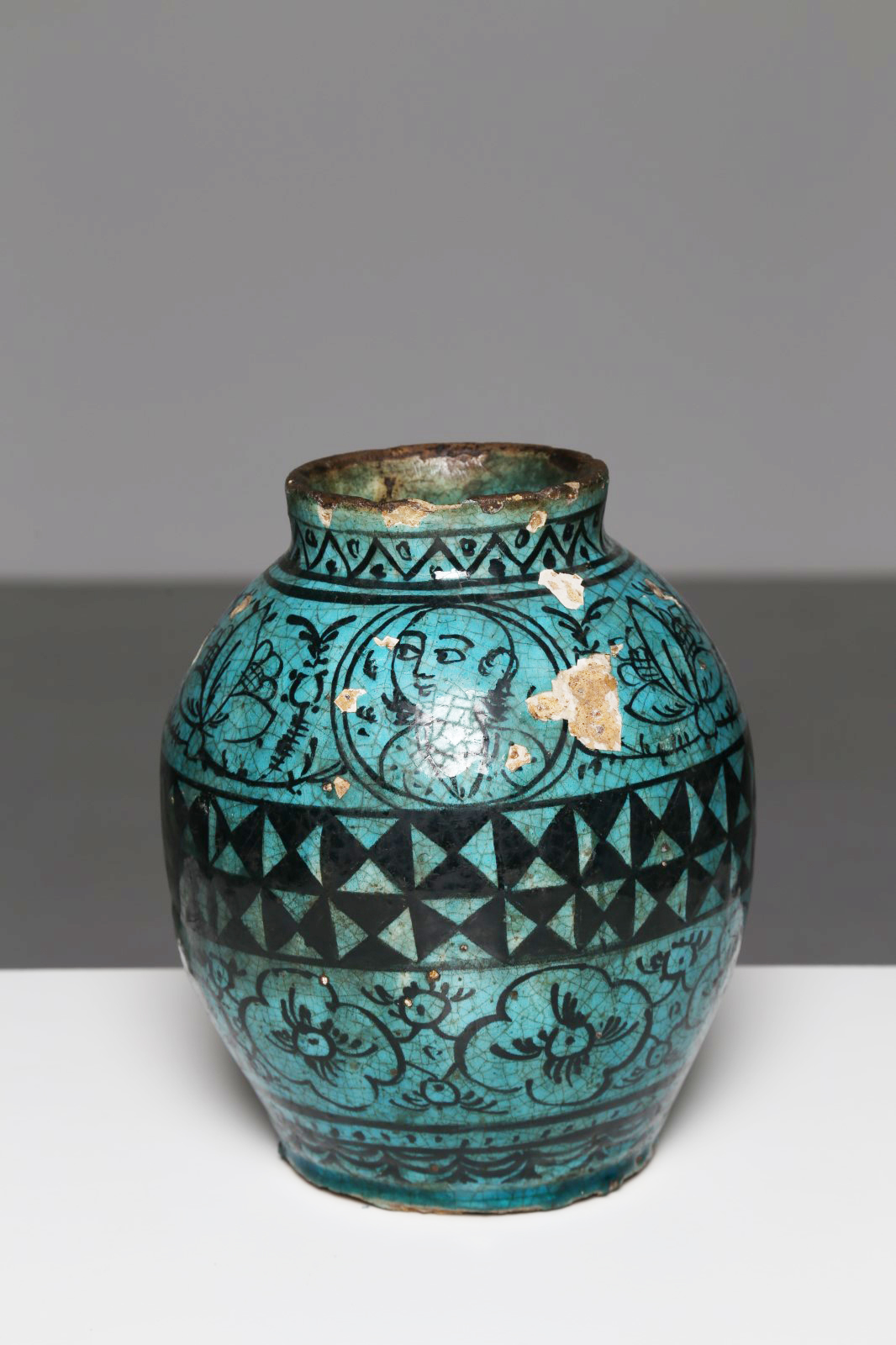 Arte Islamica Vaso Qajar turchese Iran, XIX secolo Fritta invetriata e dipinta. . Cm 25,00. Vaso di forma globulare dipinto con grandi fiori, medaglioni circolari con figure umane e fascia recante motivi triangolari nel centro. Gravi danni e mancanze.