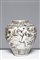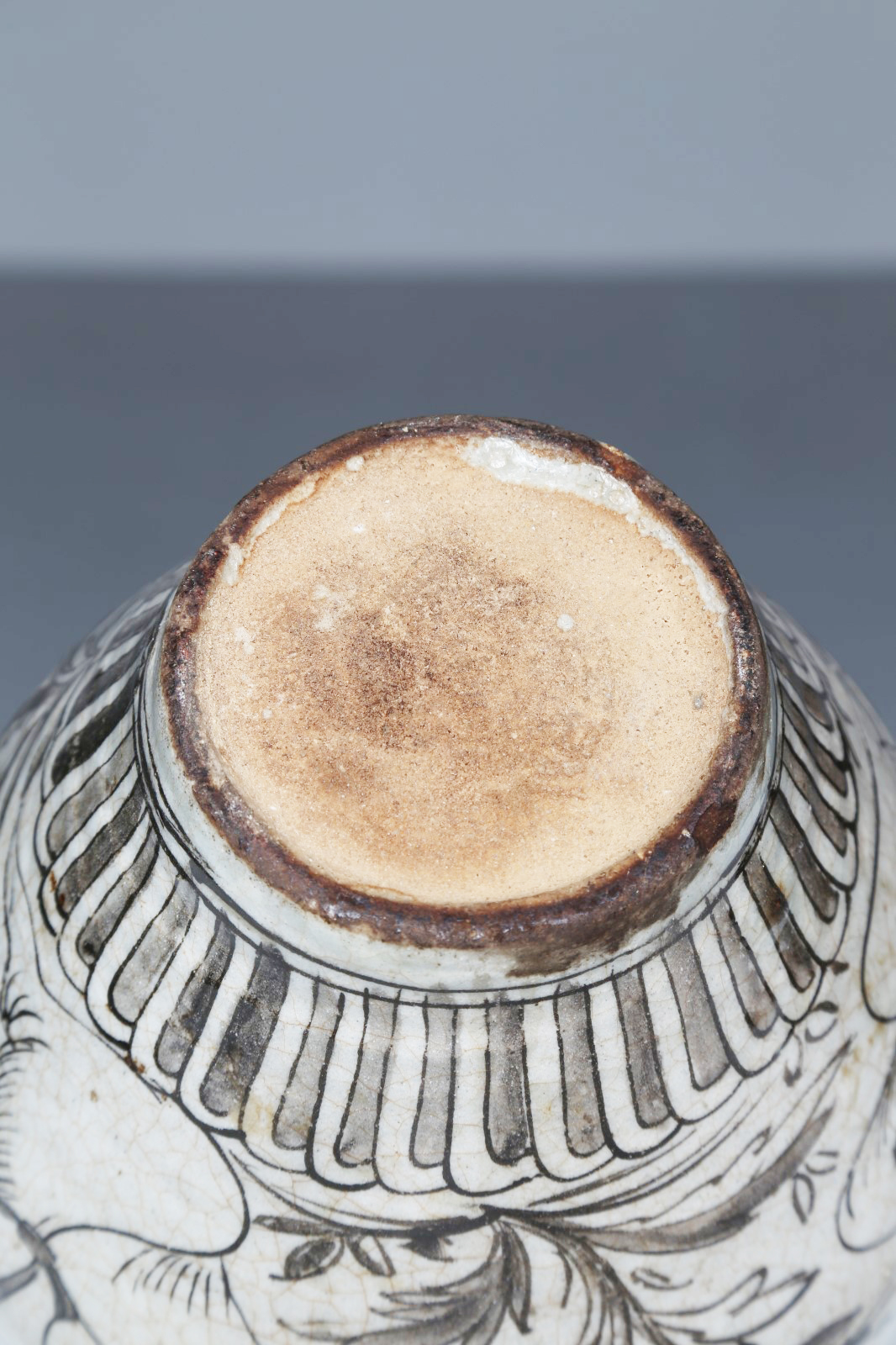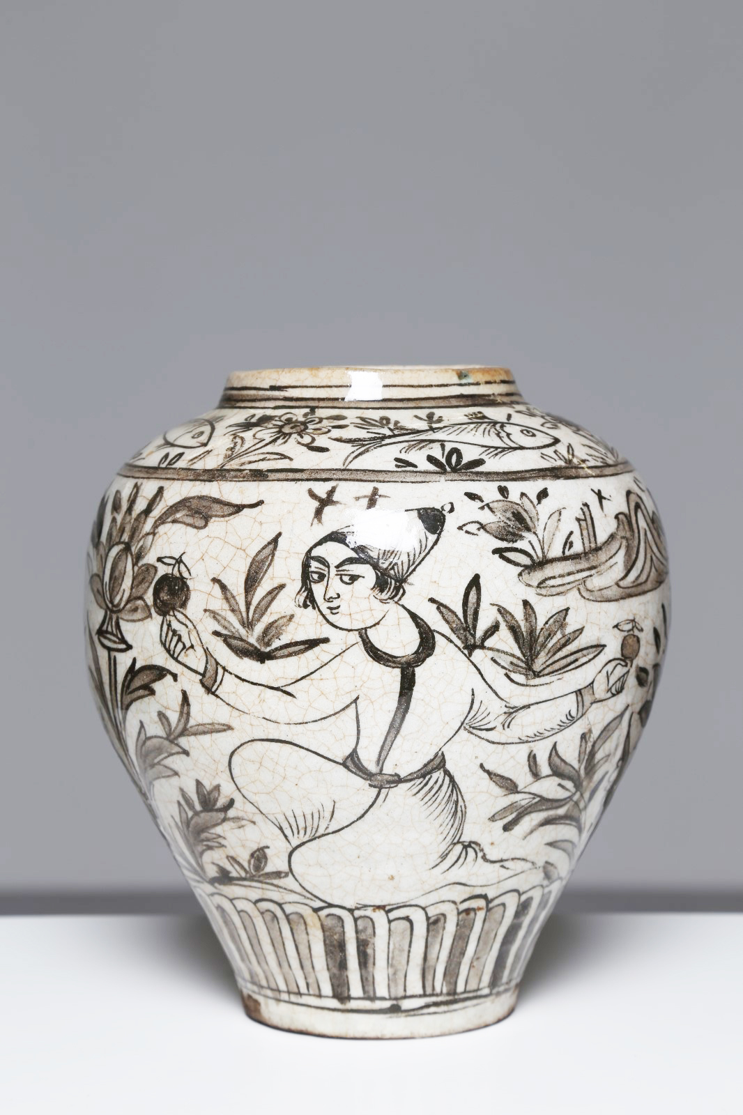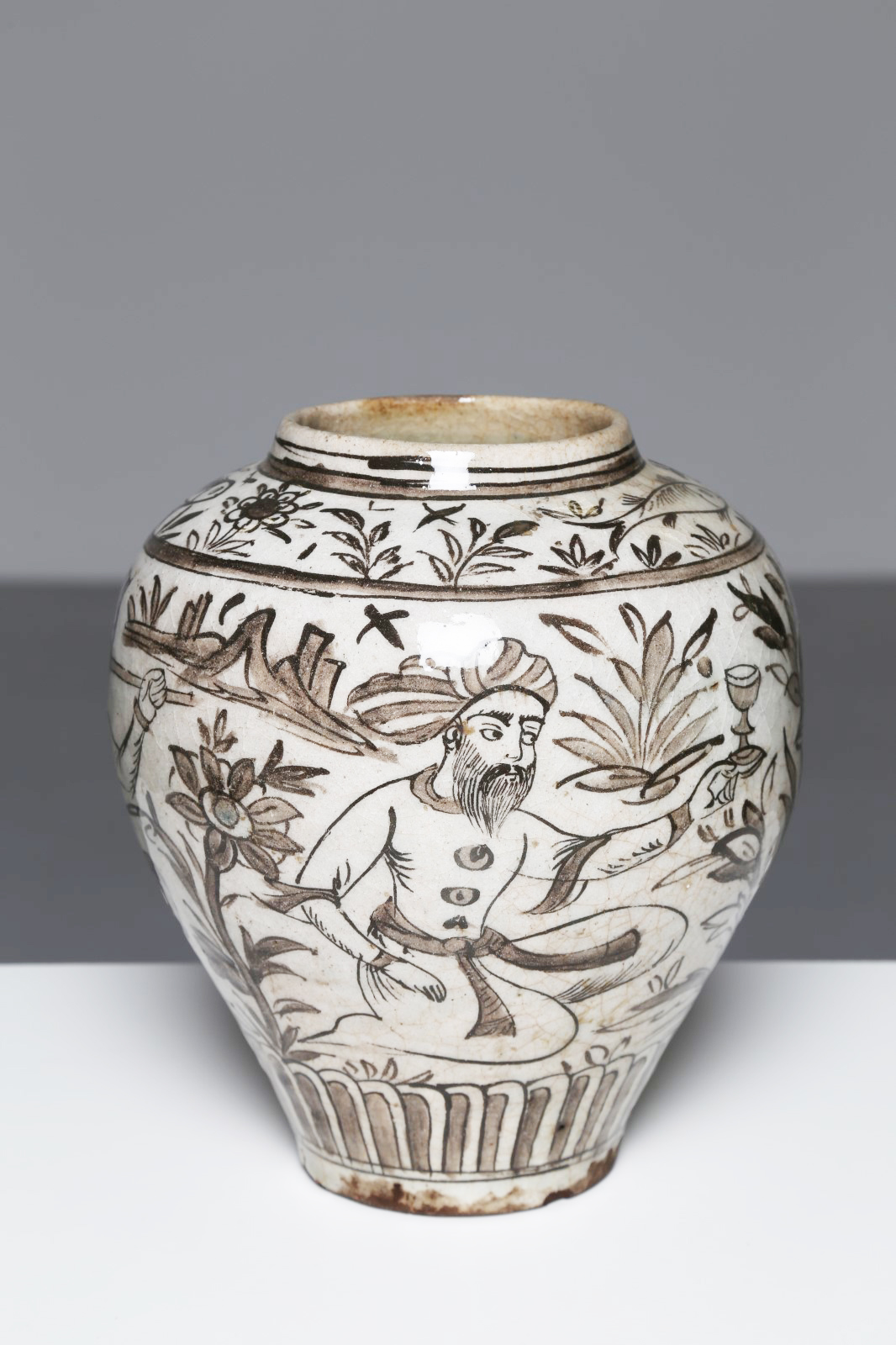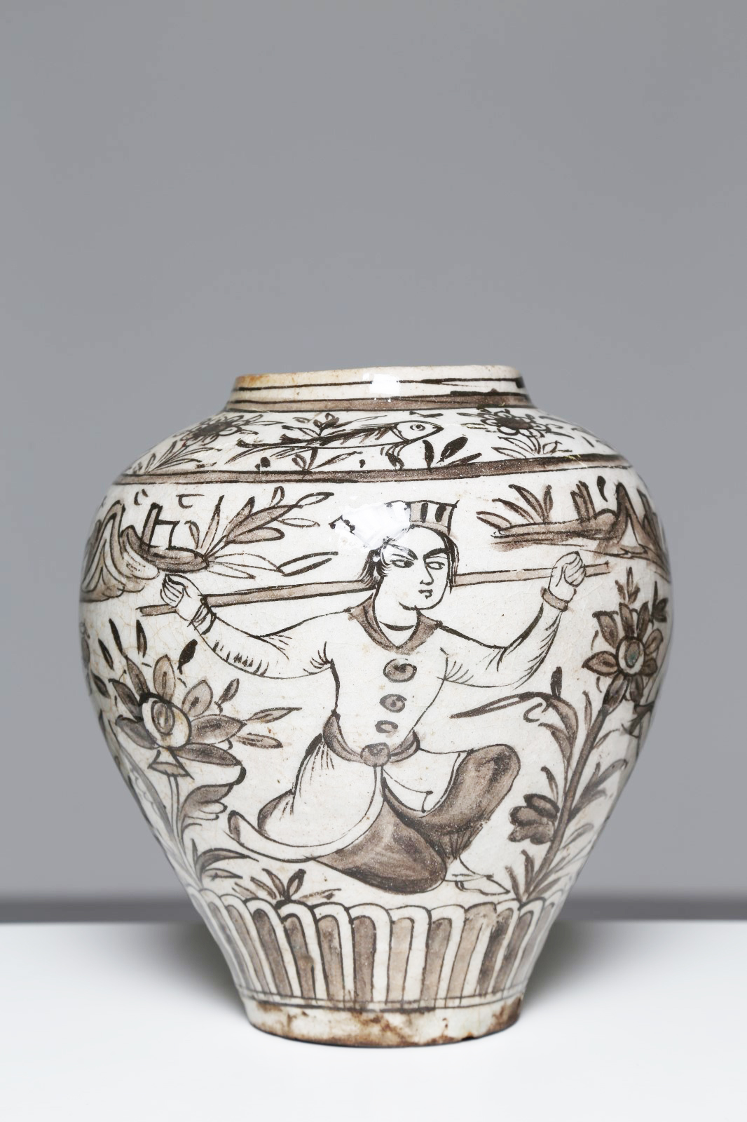 Arte Islamica Vaso Qajar Iran, dinastia Qajar, XIX secolo Fritta con decorazione sottocoperta . . Cm 29,50. Decorazione a sviluppo narrativo raffigurante uomini impegnati in attività quotidiane inframezzati da elementi vegetali ed una sottile fascia con pesci appena sotto il bordo superiore.