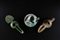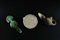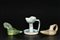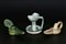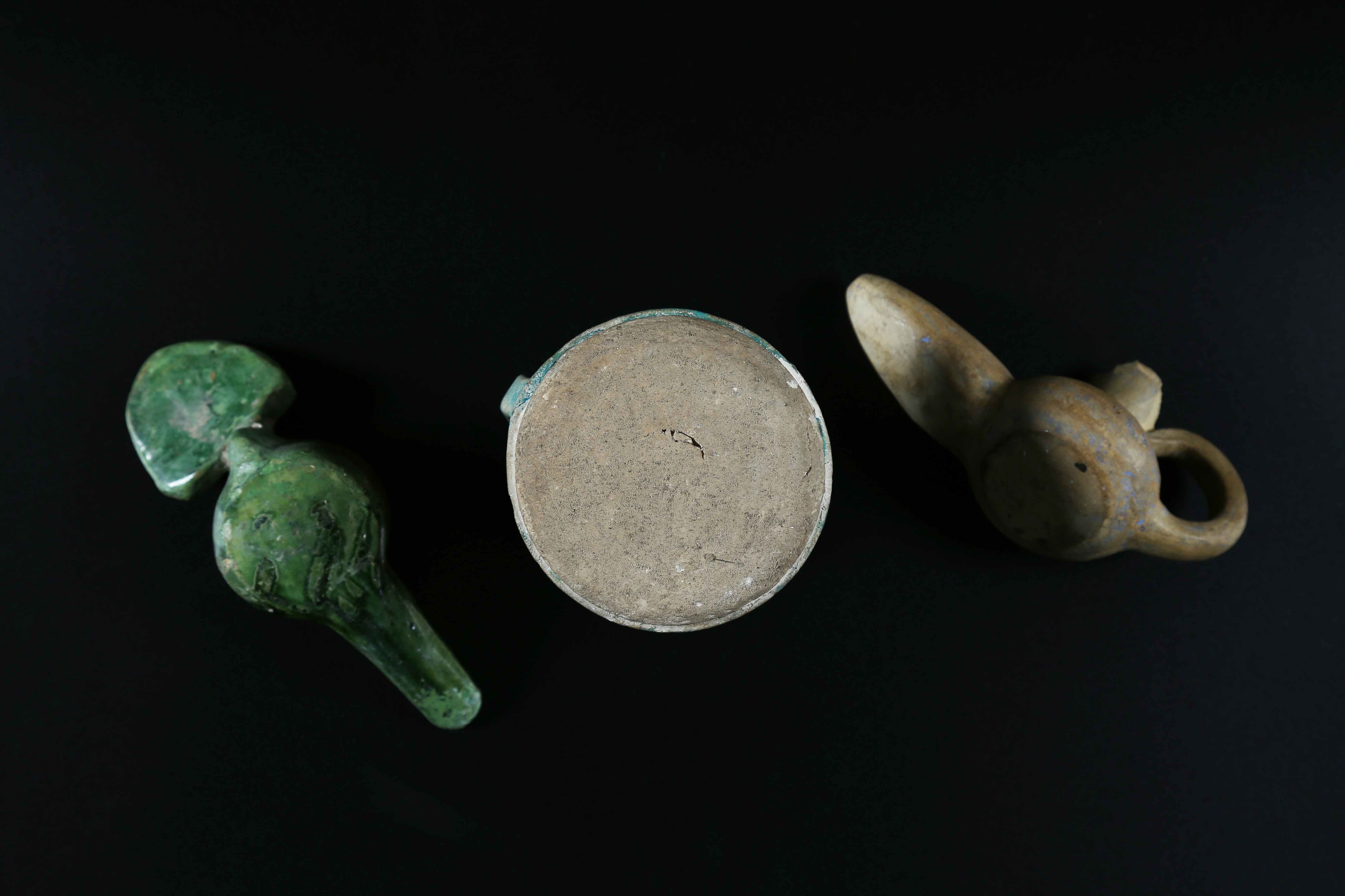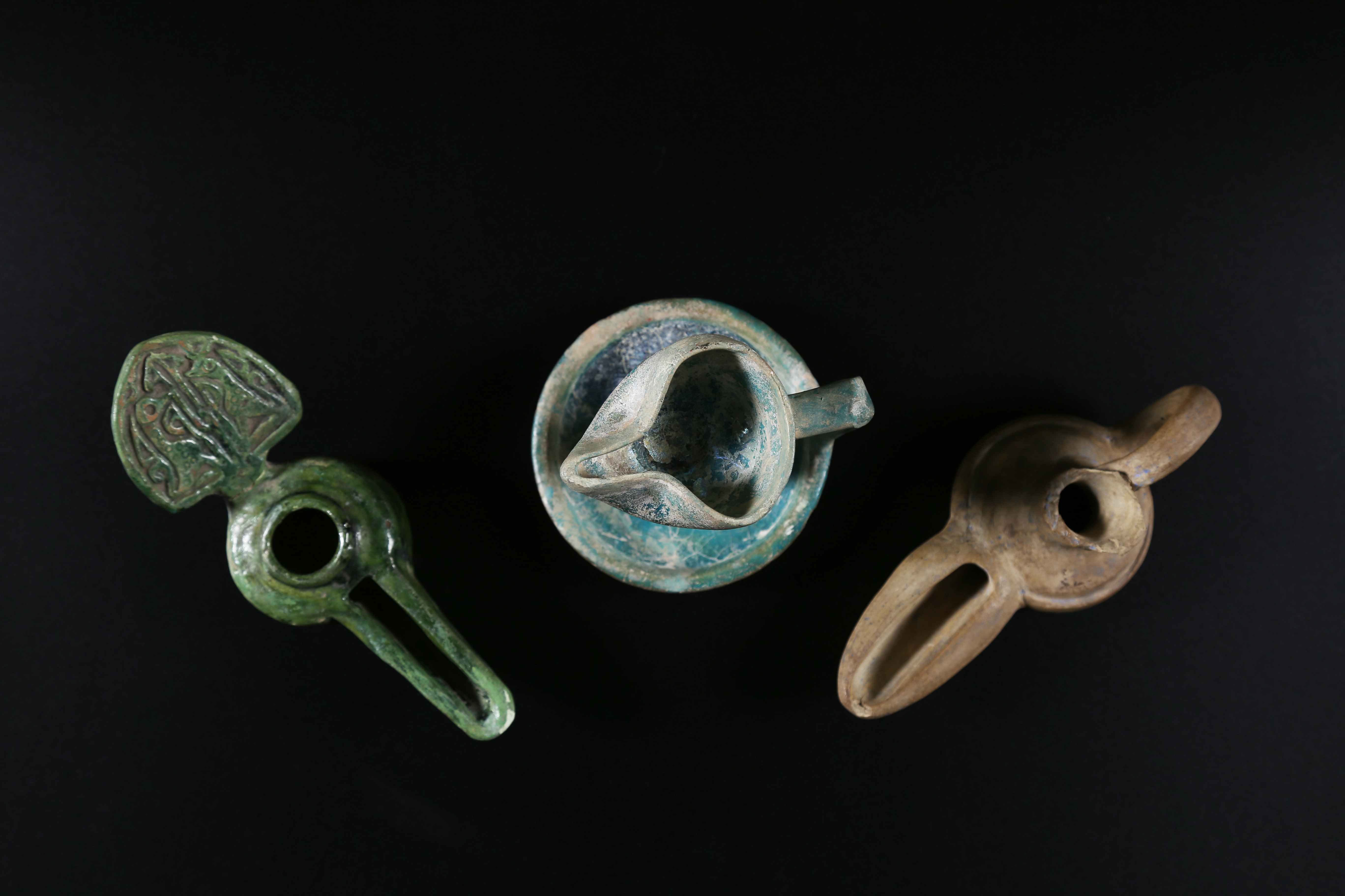 Arte Islamica Tre lampade ad olio in ceramica Iran, XI - XII secolo. . Cm 11,50. Lotto composto da tre piccole lampade ad olio mediorientali, due in ceramica invetriata di turchese e verde, l'ultima non presenta vetrina e ha parte del collo mancante. La coppa verde mostra due animali stilizzati affrontati sull'impugnatura e la turchese a forma d'orecchio, con iridescenza e cadute della vetrina.