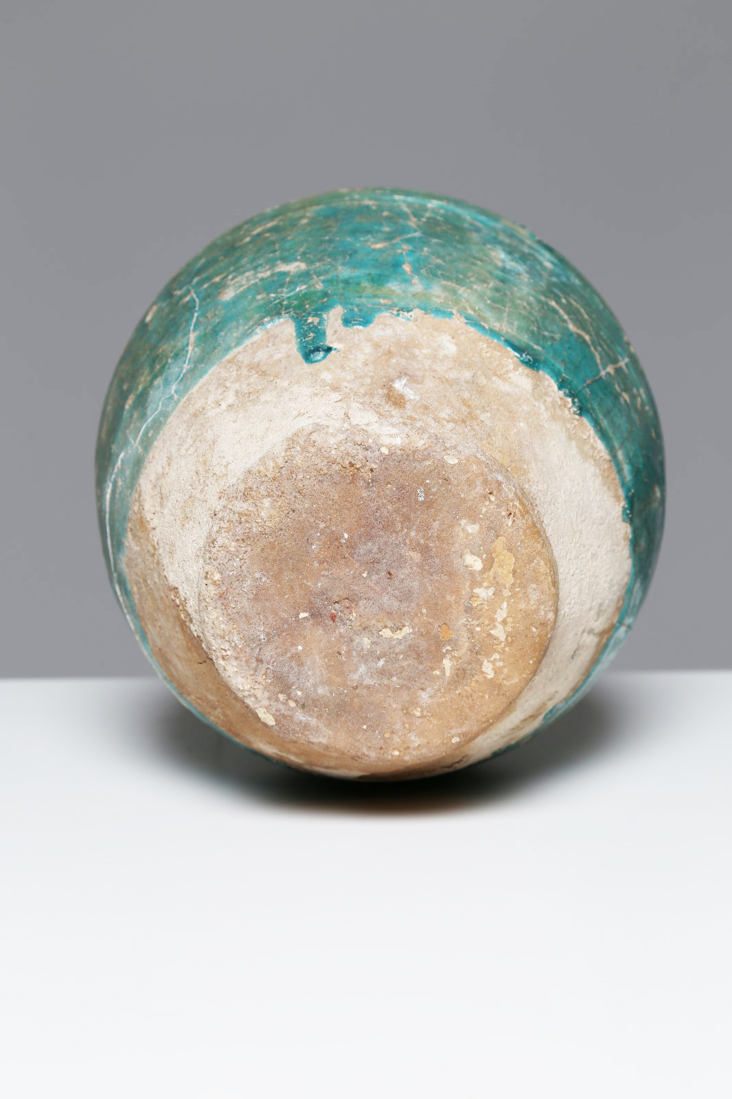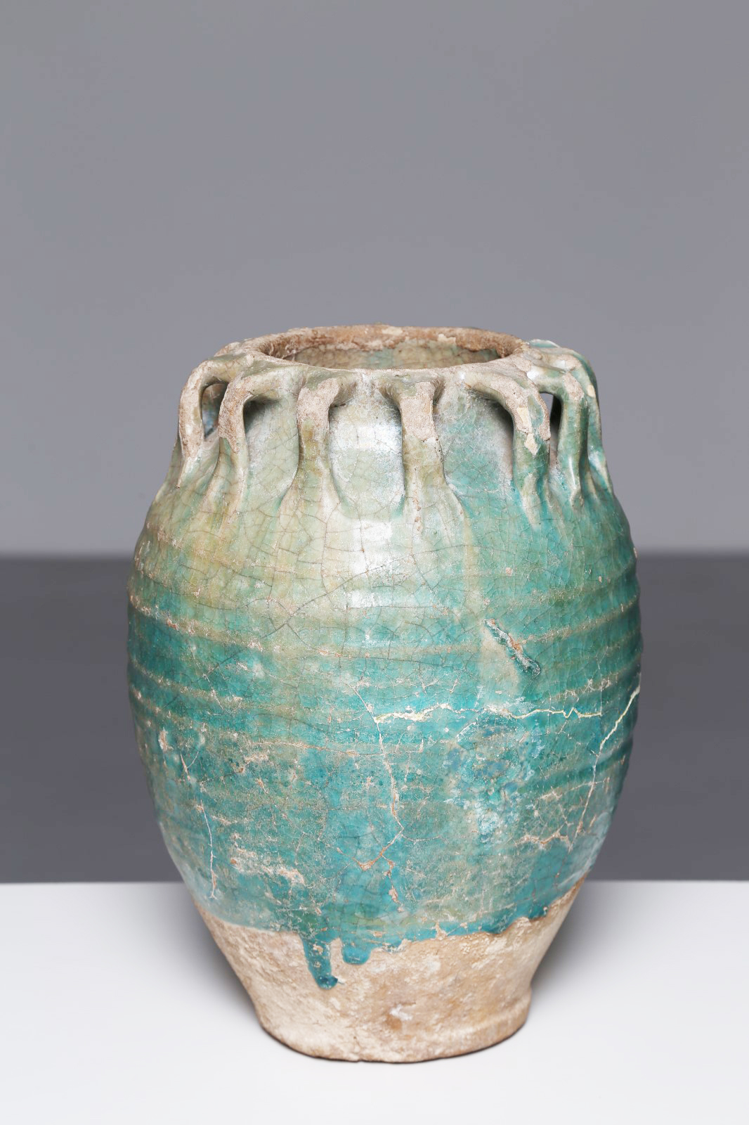 Arte Islamica Orcio Kashan Iran centrale, XII secolo o antecedente Fritta invetriata. . Cm 33,00. Grande vaso con bordo superiore costellato di tante piccole anse, rivestito di spessa vetrina turchese che con il passare del tempo ha rivelato zone di iridescenza. Giare di questo tipo erano destinate alla conservazione ed il trasporto di derrate alimentari. Danni