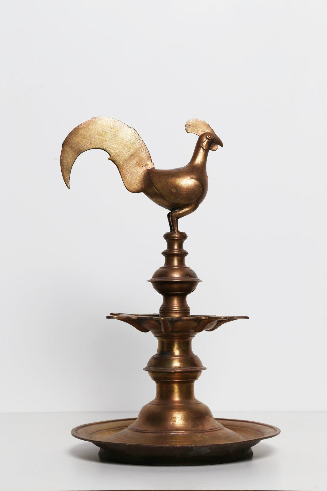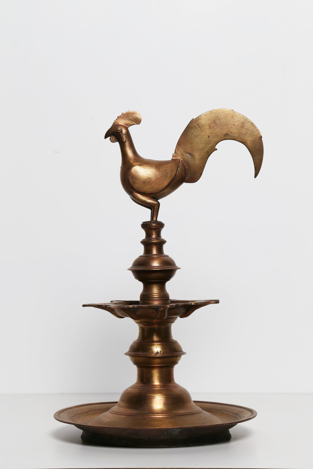 Arte Indiana Lampada ad olio in ottone terminante con un gallo India, XIX secolo. . Cm 49,00. Tradizionale lampada in tre pezzi terminante con il volatile. Un significato simbolico associato alla luce è comune in tutte le società, ma in India le lampade ad olio sono parte integrante del rituale della preghiera (puja).