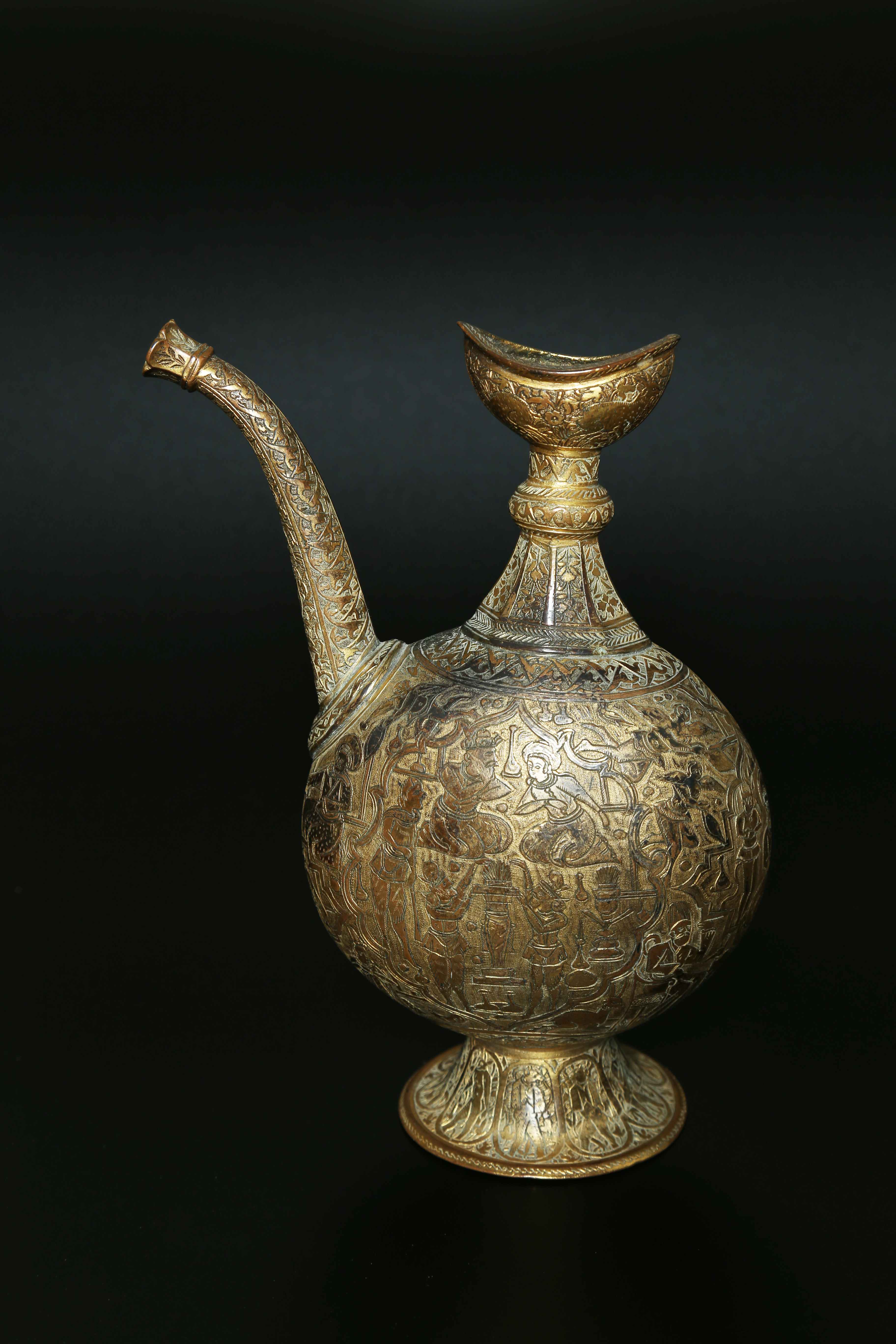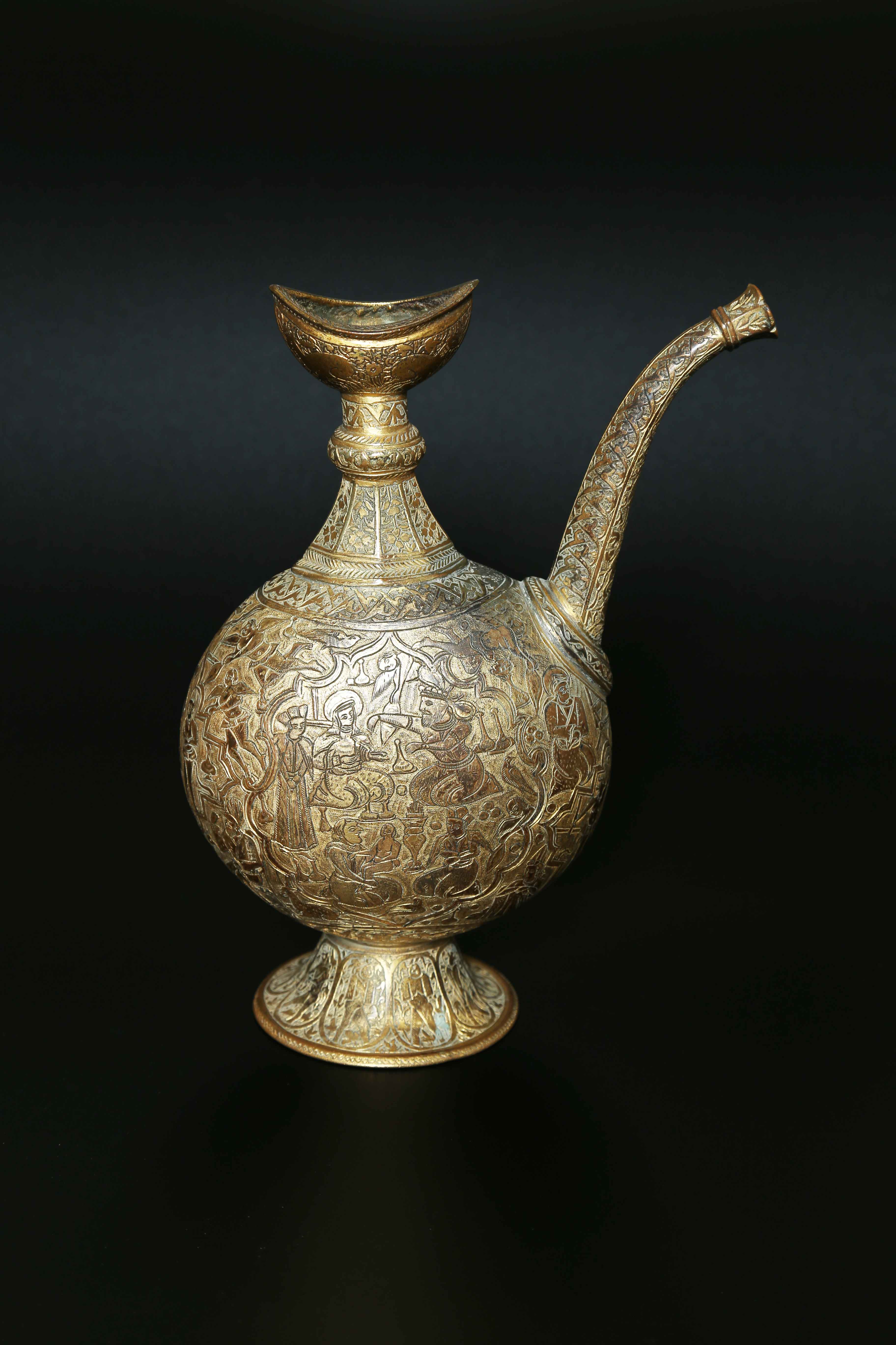 Arte Islamica Versatoio in bronzo dorato Iran, XIX secolo. . Cm 21,00. Piccolo versatoio profusamente decorato con motivi vegetali ed arabeschi alle estremità, mentre il corpo centrale è popolato di figure umane entro riserve in andamento narrativo.