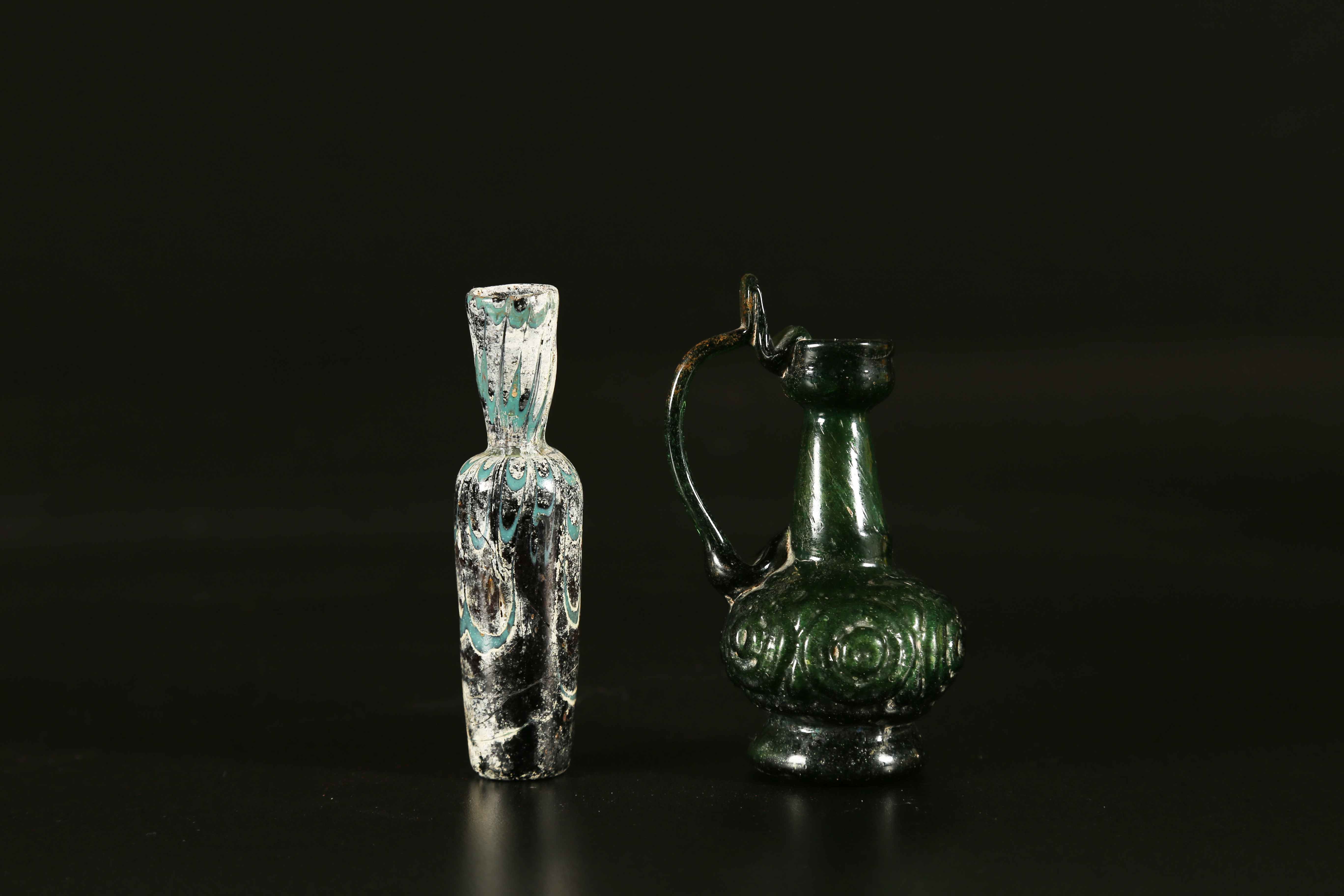 Arte Islamica Due di piccoli vetri islamici: un versatoio ed una bottiglietta con motivo di nastri "spianati" Iran, X - XI secolo Egitto o Siria, X secolo. -. Cm 10,50. Il piccolo versatoio iraniano poggia su disco, ha corpo globulare stampato con una sequenza di motivi circolari su cui si innestano il collo leggermente troncoconico e l'ansa con poggiadito, una caratteristica tipica dei versatoi in metallo da cui questo esemplare trae la sua originale forma. La piccola bottiglia del Vicino Oriente appartiene alla tipologia di vetro lavorato con nastri e "spianato" grazie alla quale si produce questo effetto colorato che può essere ad archi, festoni, fogliato o ondulato, come in questo caso.