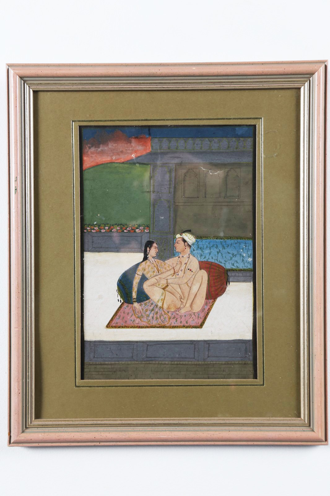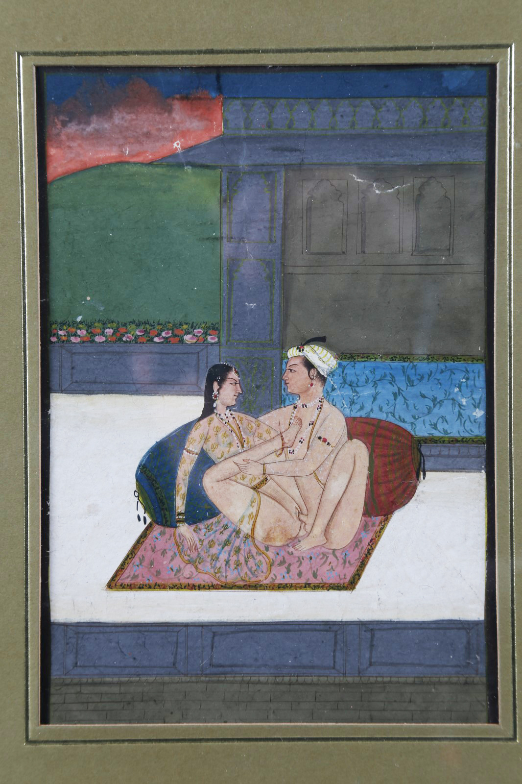 Arte Indiana Miniatura erotica India, XVIII secolo acquerello opaco e oro su carta . . Cm 14,50 x 21,00. Dipinto raffigurante una coppia durante l'amplesso nel padiglione esterno di un palazzo nobiliare all'imbrunire.