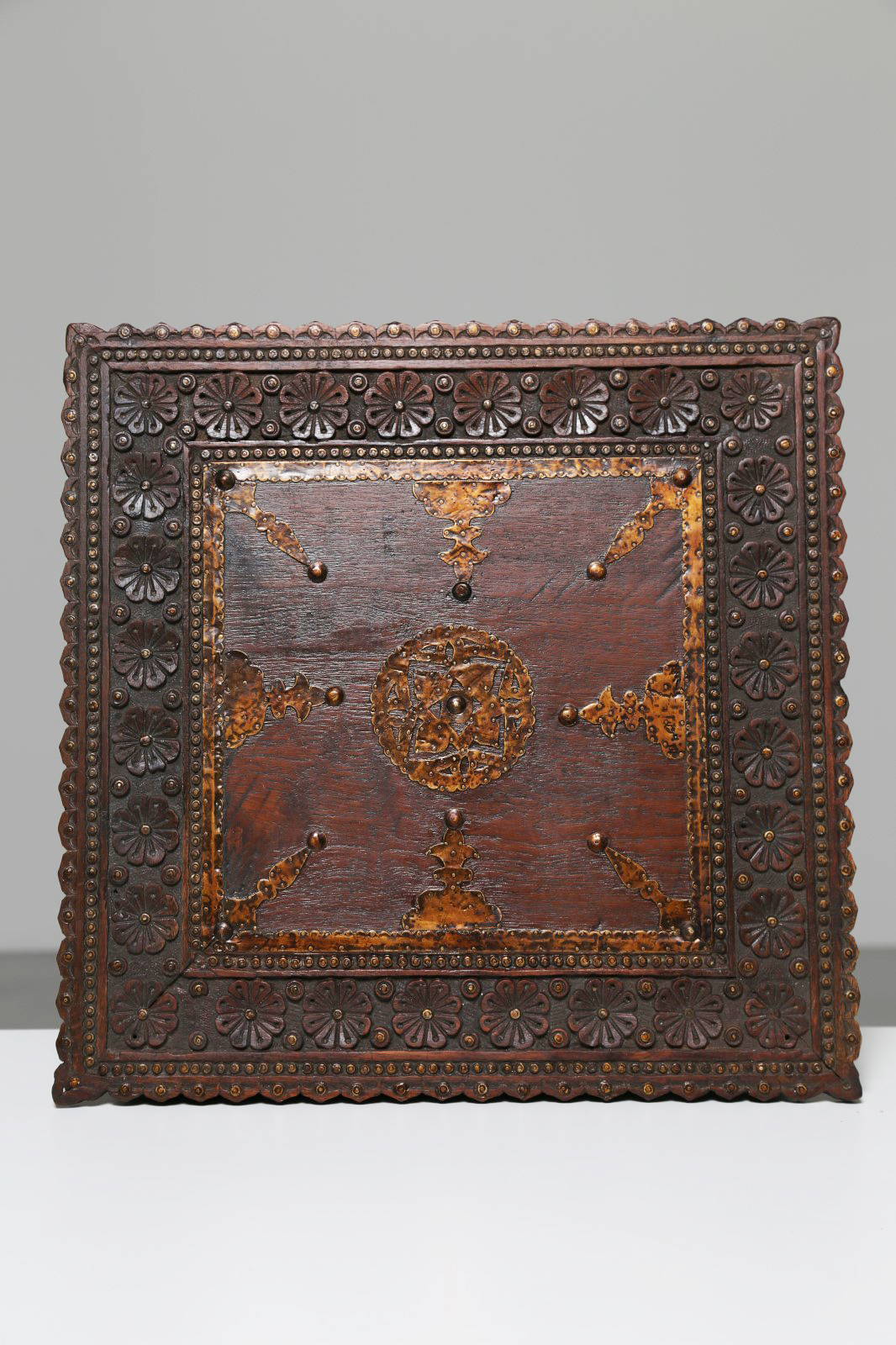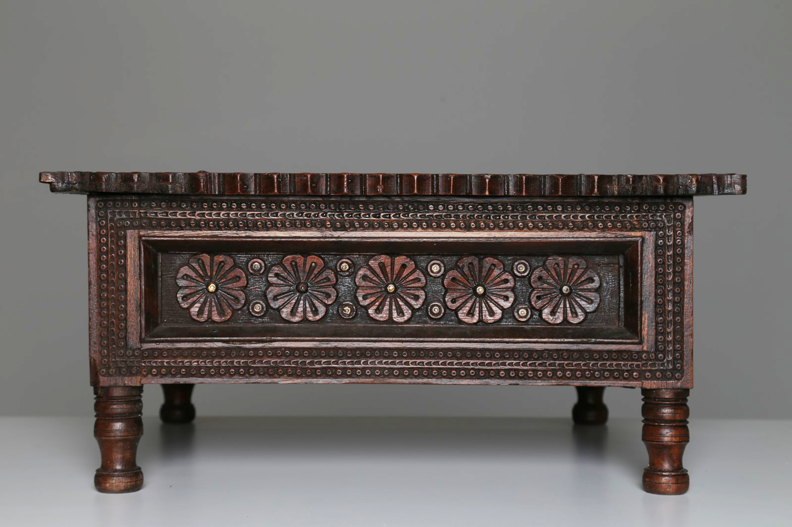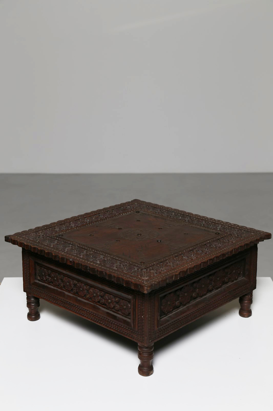 Arte Indiana Tavolino quadrato in legno intagliato e metallo India, fine XIX...